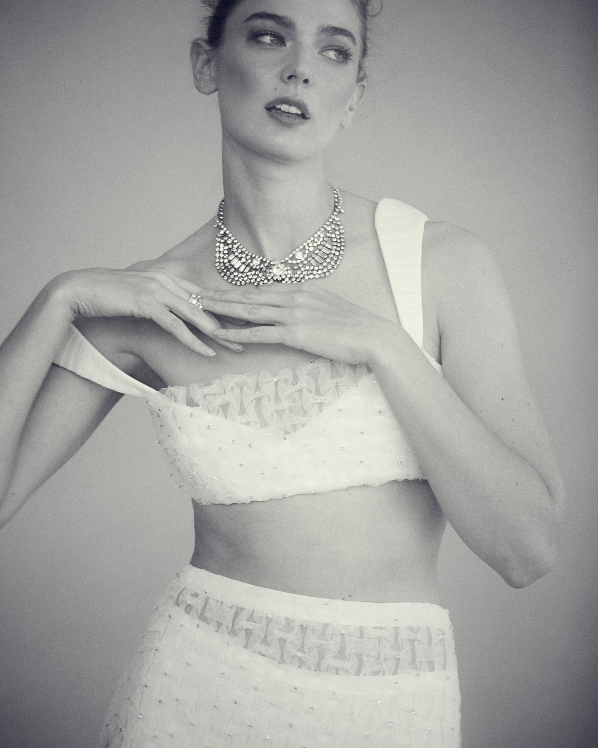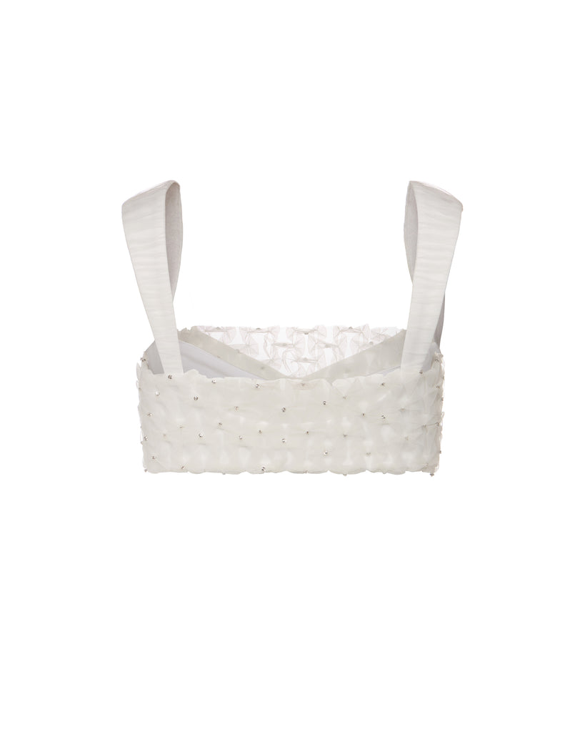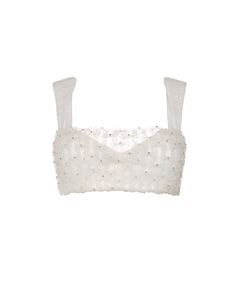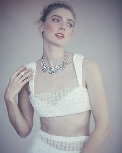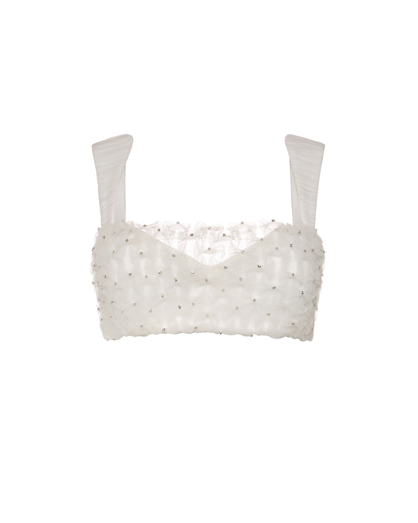 A graduate of the Savannah College of Design, award-winning Alexandra Pijut’s namesake line arrives from her studio in New York, offering luxe ready-to-wear pieces that distinguish themselves between femininity and practicality. Cut from the same hand-smocked tulle with silver crystals as the matching Lili Skirt, the Marie Top features a bandeau silhouette with gathered, tulle straps. With an interior layer creating a soft V-neckline, the smocked, tulle overlay creates a minimalistic yet ethereal effect.
