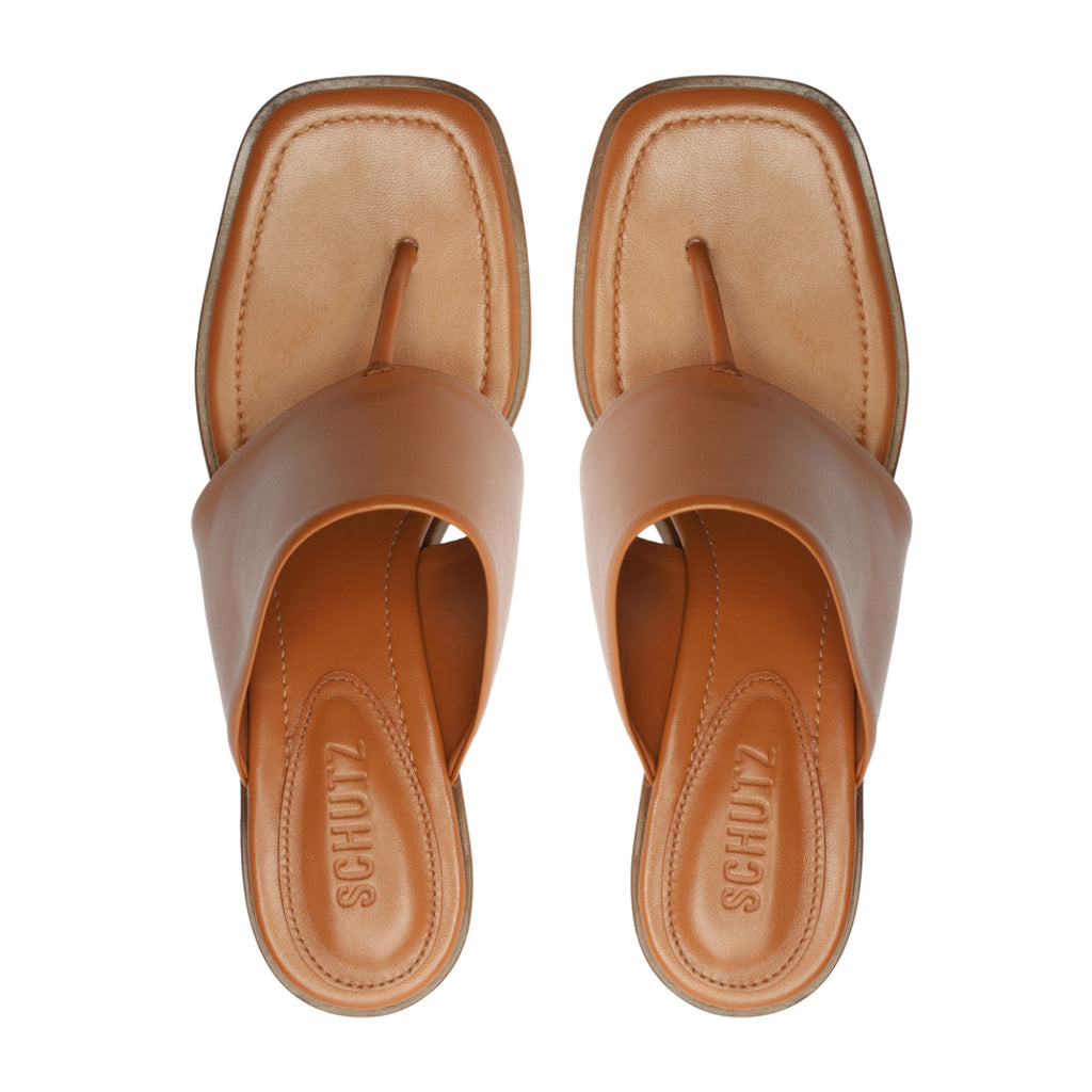 Leather upper. Leather lining. Man-made sole. Block heel. Thong mule silhouette.