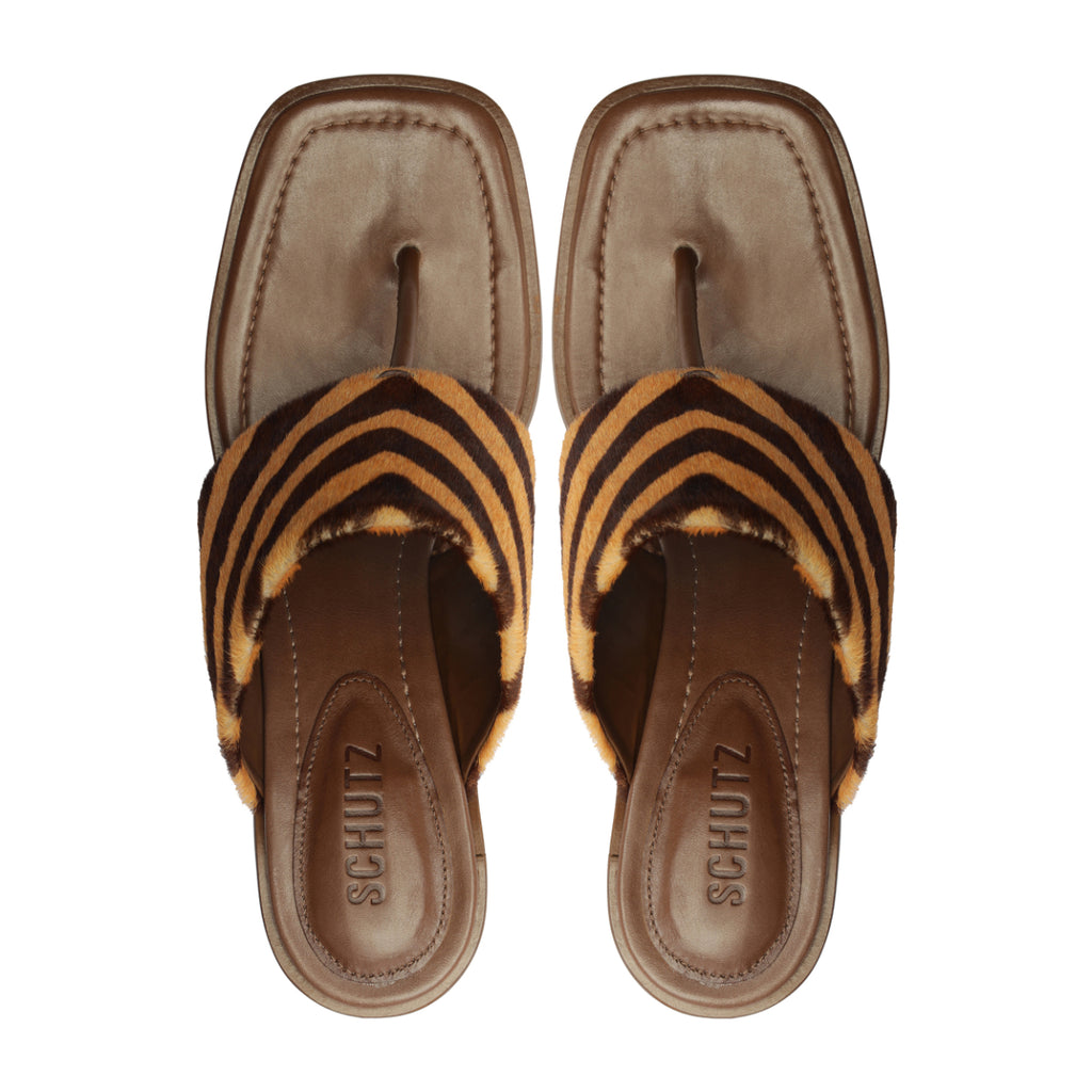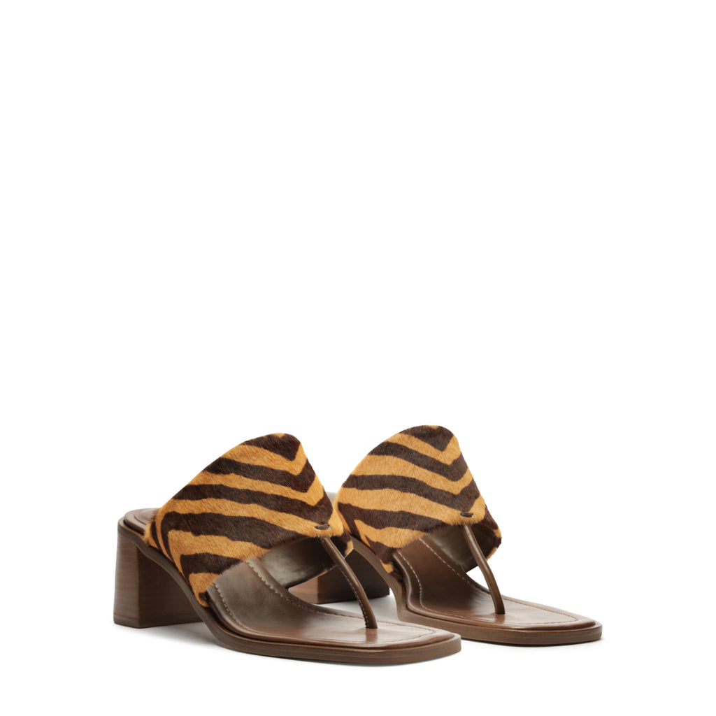 Calf hair upper. Leather lining. Man-made sole. Block heel. Thong mule silhouette.