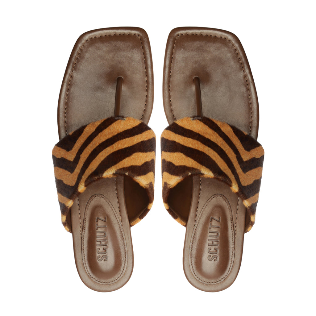Calf hair upper. Man-made lining. Man-made sole. Flat sandal. Thong entry. Slip-on style.