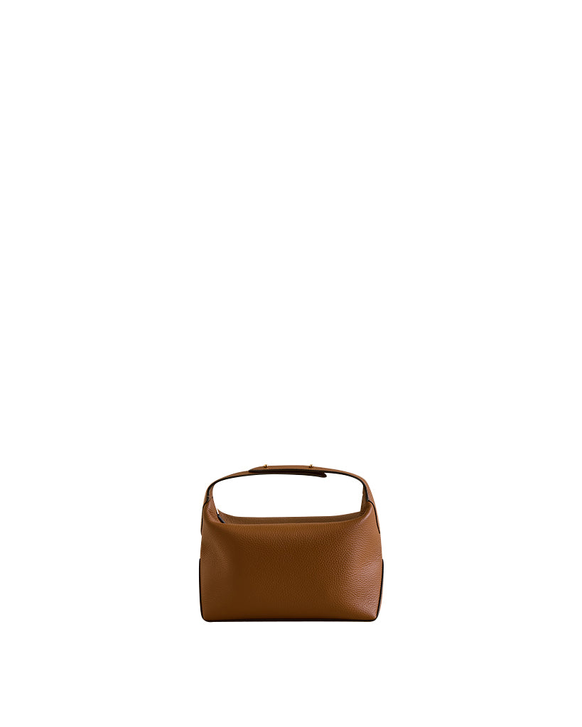 100% tumbled grain calfskin leather. 100% lambskin suede lining. Inner gold foil stamp logo. Outer blind stamp logo. Single zipper top closure. One inner flat pocket. Single handle strap.