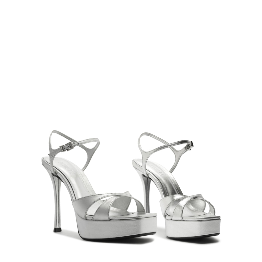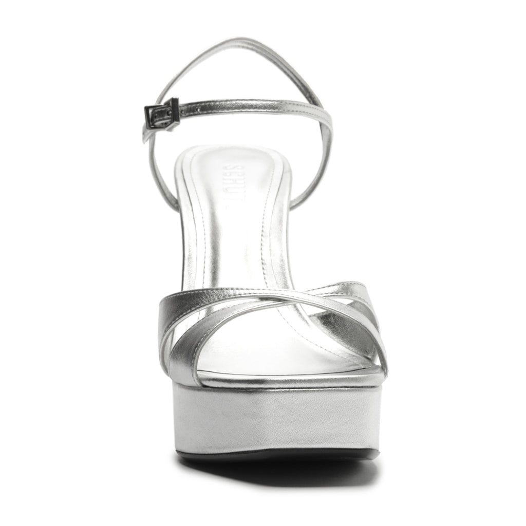 Metallic upper. Man-made lining. Man-made sole. Platform sole. Stiletto heel. Open-toe silhouette.