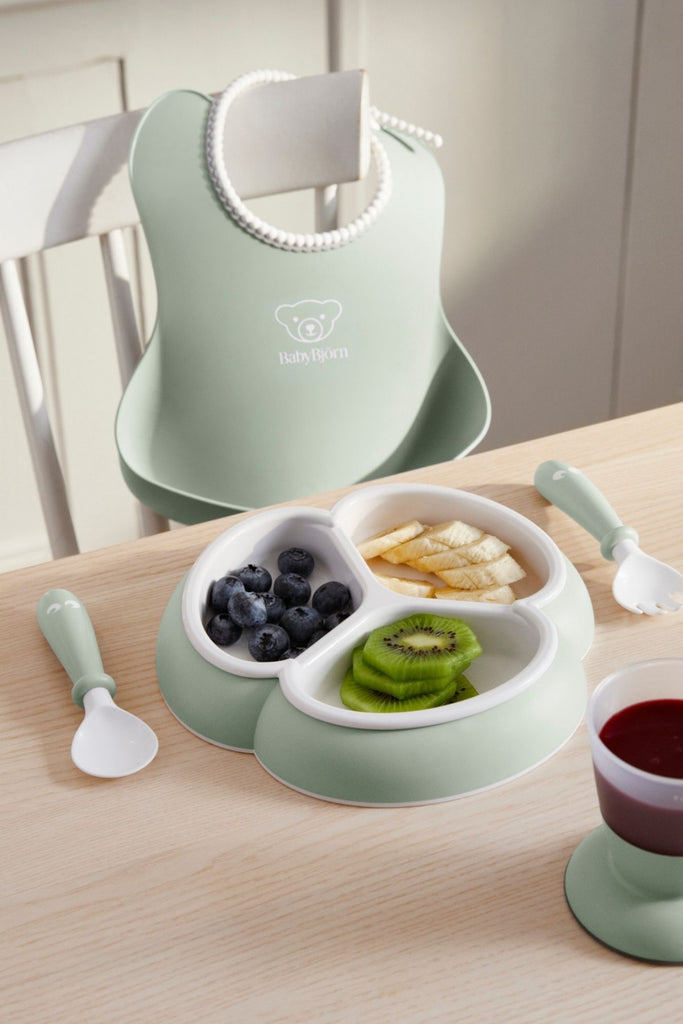 Rooted in Swedish design and a family-first ethos, BabyBjörn crafts intuitive, durable essentials that nurture the bond between parent and child while celebrating the joy of early moments. The Mealtime Set in Powder Green, Set of 4, simplifies feeding for little ones learning to eat on their own. With thoughtfully designed details like a trefoil-shaped plate for easy scooping, easy-grip utensils, and an adjustable bib with a deep spill pocket, this set combines practicality with timeless Scandinavian charm.