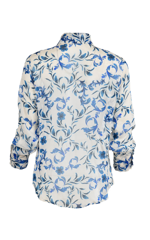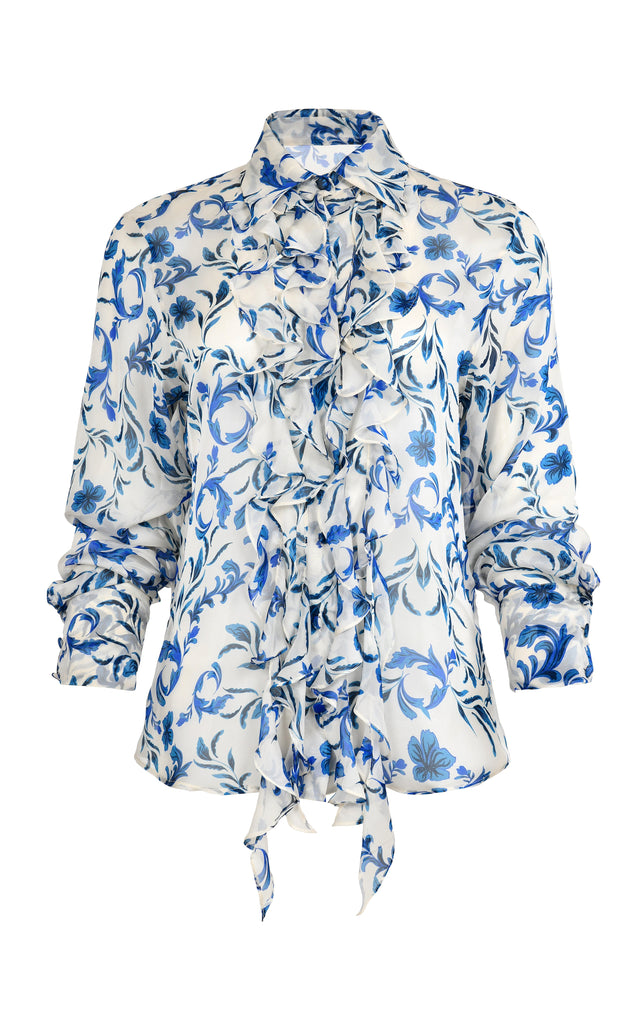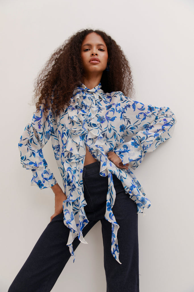 From her atelier in Barranquilla, Colombia, Francesca Miranda combines the diverse, indigenous aesthetic of her surroundings, as well as her own European roots, to produce sumptuous womenswear, bridal, and household objects, each bearing the essential spirit of artistry and craftsmanship. The Medusa Blouse is light as air and boldly feminine, featuring cascading ruffles and a vibrant blue floral print. Crafted in sheer, fluid fabric, it moves beautifully with the wearer, embodying effortless elegance and refined artistry.