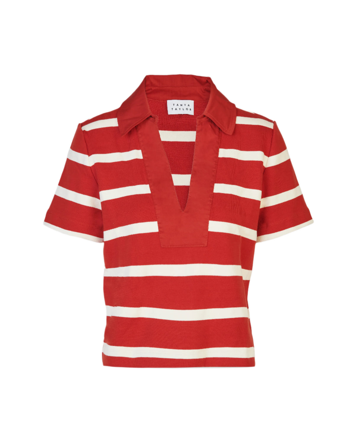 Creating clothing that inspires confidence, celebration, and community, Tanya Taylor is a New York-based womenswear brand whose mission is to provide practicality and style to a range of ready-to-wear in inclusive sizes. Each collection is thoughtfully designed through the artful use of color, texture, and original hand-painted prints. The Melanie Top in Brick & Cream Stripe is a breezy update to the best-selling Whitney Top, reimagined for summer in a relaxed silhouette with short sleeves. Designed in an organic cotton rugby stripe with a contrast collar and v-neckline, it delivers playful polish for everyday styling.
