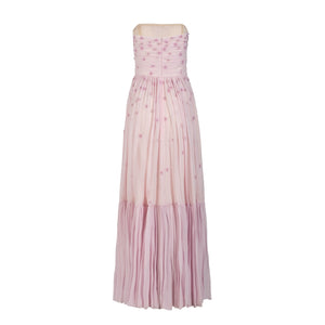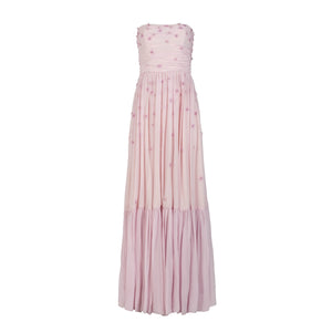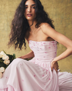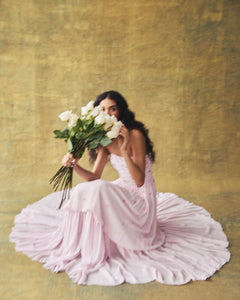 A graduate of the Savannah College of Design, award-winning Alexandra Pijut’s namesake line arrives from her studio in New York, offering luxe ready-to-wear pieces that distinguish themselves between femininity and practicality. The Melissa Dress in Peony Georgette with Miniature Flower Embellishment is a romantic study in texture and form, featuring soft draping, floral embellishments, and a fitted corset bodice that transitions into a flowing, gathered skirt.