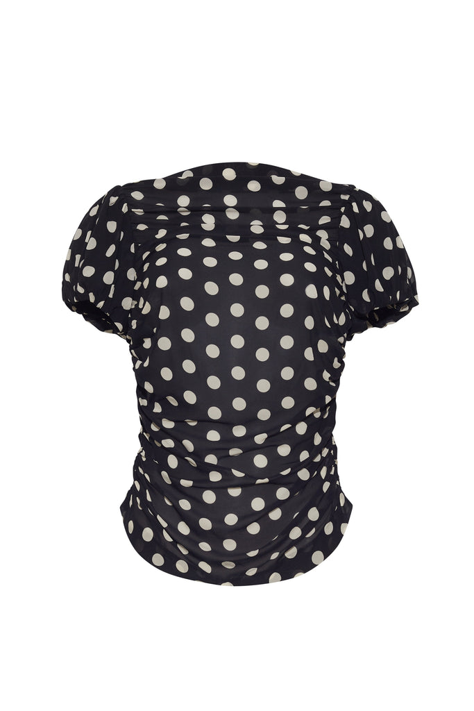 Fitted puff-sleeve ruched top in stretch silk with allover dot print. Elasticated sleeve openings for a bubbled effect. Center back invisible zipper with hook-and-eye closure. Unlined.