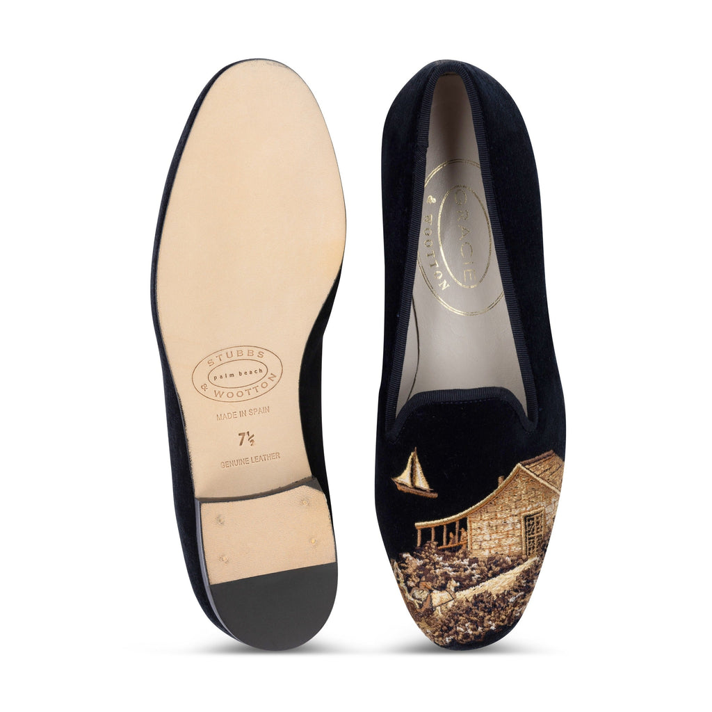 Founded in Palm Beach, Florida, Stubbs & Wootton has perfected the art of creating elevated, handmade women’s, men’s, and children’s shoes. Known for their exquisite needlepoint and embroidery, their slippers feature all-over patterns and fun, intricate accents. The Men’s Nantucket Navy Velvet Slipper is crafted from luxurious cotton velvet and trimmed with tonal silk-cotton grosgrain. Its sepia-toned embroidery captures a scene of a grand sailboat arriving into a harbor, evoking the timeless spirit of seaside escapes.
