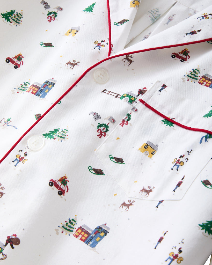 Petite Plume wishes you a “bonne nuit,” and in their luxury sleepwear, it’s hard not to oblige. The joyful sights of this peaceful holiday village will take you down memory lane. Santa winds his way through town, while vintage cars and wooden sleighs glide past pristine wintry decorations. This classic set has a roomy fit but looks crisp thanks to details like the classic collar. The fabric is made from 100% of the finest quality cotton. It is yarn-dyed to prevent fade and brushed for added softness making the sleepwear feel absolutely luxurious, getting cozier after each wash.