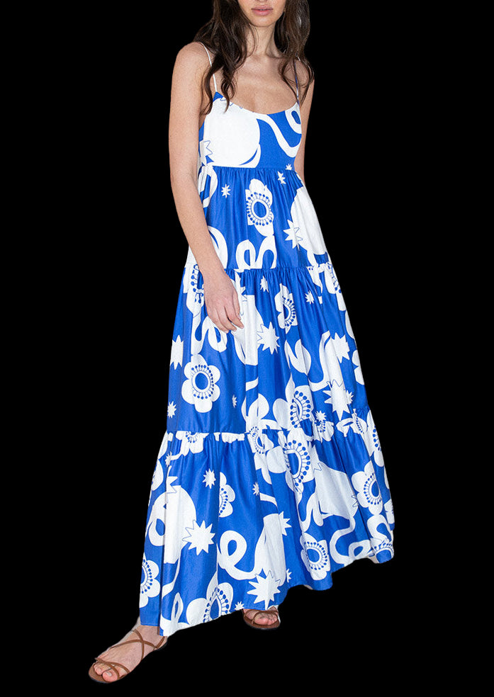 Inspired by the great art museums of the world, Carmen Borgonovo and Joana de Noronha use romantic silhouettes and surreal, bespoke prints, to create dresses that not only empower women, but transport them. These versatile, tailored pieces will bring joy to your wardrobe, and glamour to your world. Featuring an empire waist and flattering spaghetti straps, the Merle Cotton Maxi Dress in Tropical Night Blue is a tiered maxi that elevates your look no matter where you wear it. With a print inspired by intricate Venetian mosaics and glasswork, and easily dressed up or down, this is a piece that says endless summer.