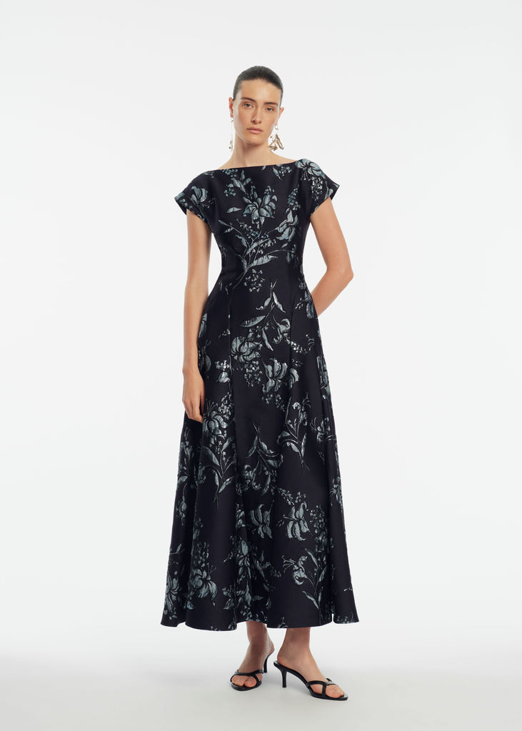 New York City–based Lela Rose employs a brilliant use of color, rich fabrications, sculptural silhouettes, and handcrafted detail in her bridal and ready-to-wear looks. These designs have been worn by the likes of First Lady Michelle Obama, Gwyneth Paltrow, Selena Gomez, and sophisticated women around the world. The Metallic Floral Jacquard Seam Detail Dress in Navy showcases the brand’s refined craftsmanship and signature artistry. Crafted from luxurious jacquard woven with metallic floral threading, this A-line silhouette features a bateau neckline, cape cap sleeves, and cascading inverted seams that lend graceful movement and timeless polish.