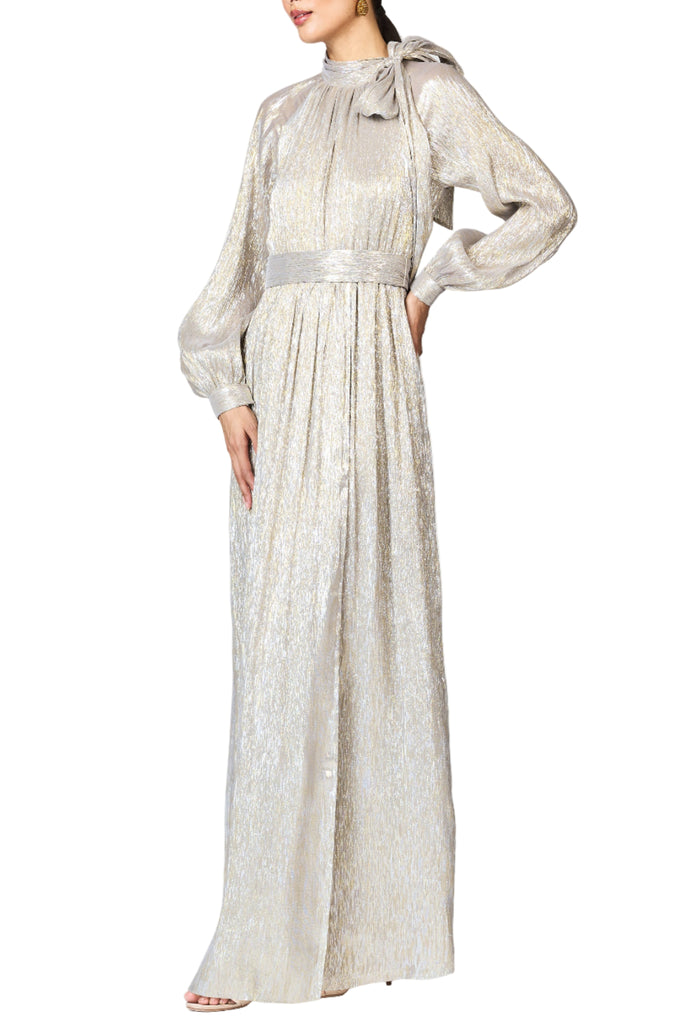 The Vera Gown embodies effortless glamour with an ethereal ease. Crafted from luminous silk lamé, this fluid silhouette drapes beautifully over the body, defined by a soft waist belt and finished with a delicate neck tie. Romantic and refined, Vera shimmers with understated grace—an unforgettable statement for any occasion.
