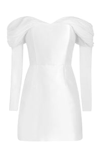 Named for a particularly radiant group of galaxies, Markarian combines designer Alexandra O’Neill’s love of the cosmos and celestial romanticism with timeless design and modern silhouettes. A forward-thinking approach to fashion and a focus on fine craftsmanship result in dresses that are beautiful, well-made, and flattering. To that end, the Mia White Silk Mini Dress, crafted from luxe silk tulle, features a draped neckline and long sleeves with a detachable belt.