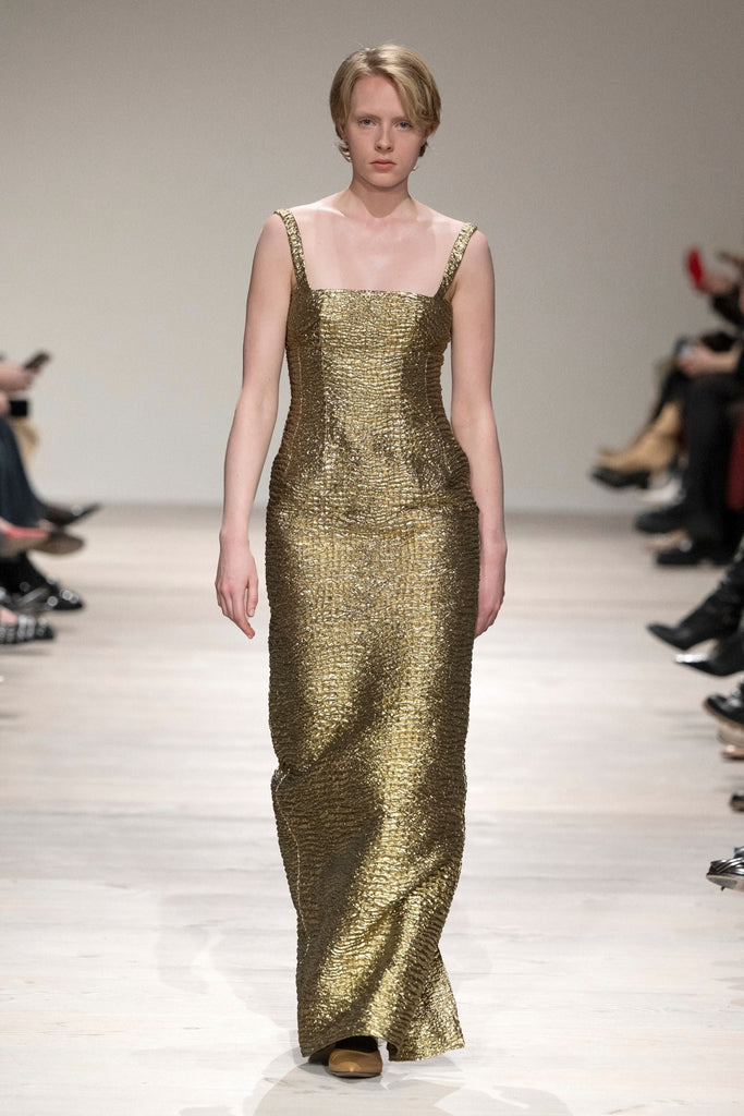 Emilia Wickstead is the epitome of modern femininity. Established in the U.K. in 2008, the ready-to-wear designer is known for impeccable tailoring, bold color, and timeless quality. The Micheline Dress in Gold Metallic Seersucker captures timeless evening elegance with a contemporary edge. A sculpted square neckline and fitted bodice flow into a sleek column silhouette, defined by the clean architectural lines emblematic of the brand.