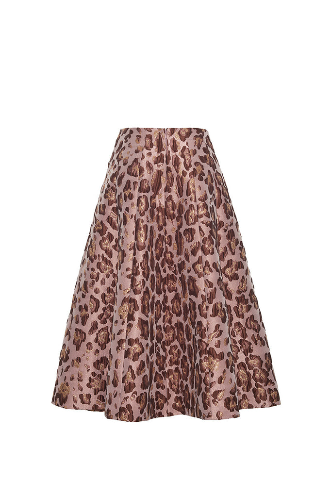 High-waisted A-line midi skirt in Painted Animal Blush Metallic Jacquard. Panel detailing at front and back. Functional seam pockets. Center back invisible zipper with hook-and-eye closure. Fully lined. Placed jacquard pattern.