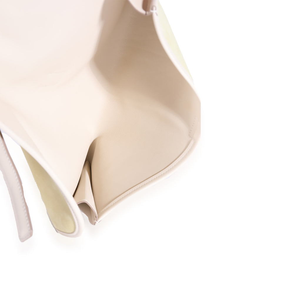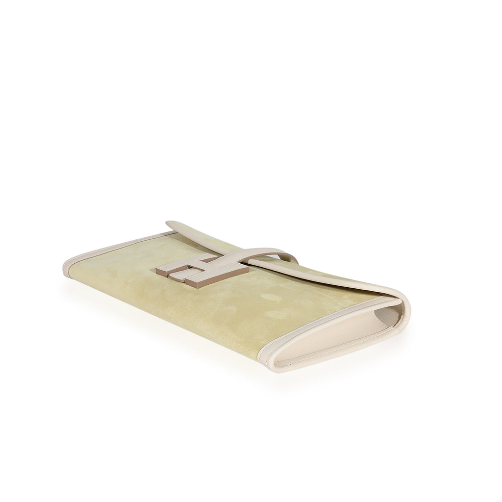 Pre-owned Hermès Jige Elan 29 in Mimosa Veau Doblis suede and Craie Swift leather, circa 2016. Item has no indication of wear. Features tonal stitching, fold-over flap with “H” strap closure, and soft leather interior. Includes original box, dustbag, care booklet, and felt protector. Made in France.