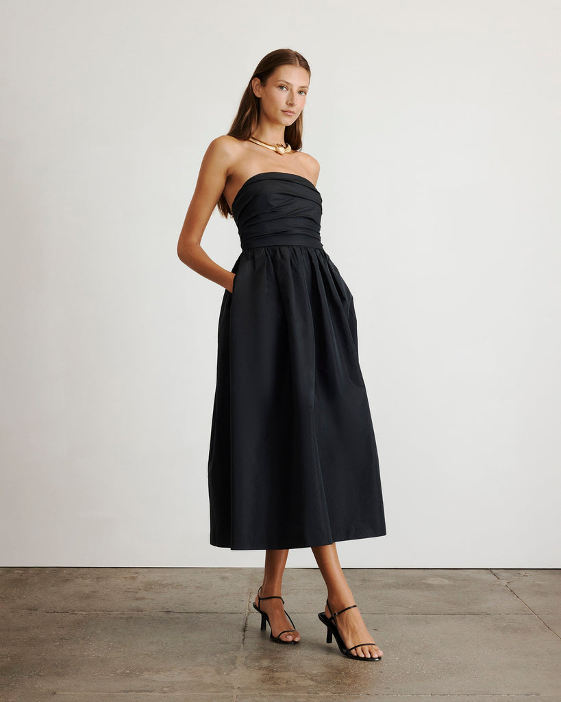 Creating clothing that inspires confidence, celebration, and community, Tanya Taylor is a New York-based womenswear brand whose mission is to provide practicality and style to a range of ready-to-wear in inclusive sizes. Each collection is thoughtfully designed through the artful use of color, texture, and original hand-painted prints. The Mina Dress in Black is a statement silhouette crafted from luxe taffeta, offering timeless elegance with modern structure. Featuring a strapless bodice with artfully draped detailing and a pleated midi skirt, it’s designed to flatter the figure and move beautifully with every step.