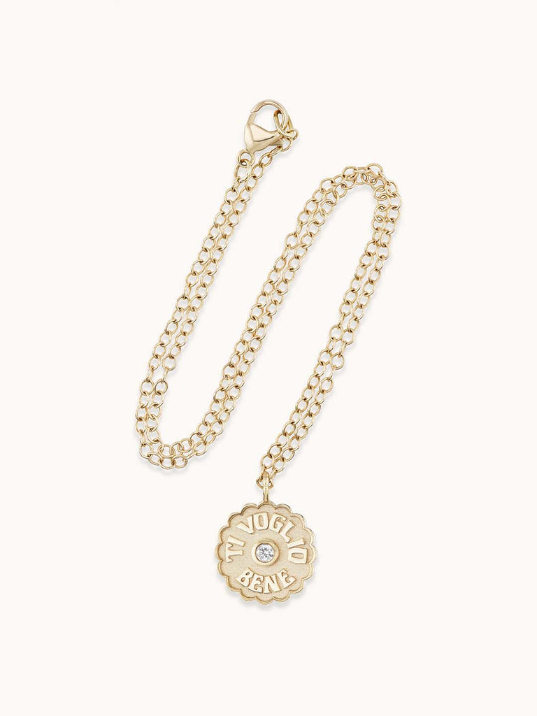 Founded by designer Jesse Marlo Lazowski, Marlo Laz creates modern heirlooms infused with meaning, blending language, symbolism, and craftsmanship into poetic expressions of love. From the *Moonstruck* Collection, the Mini Raised Gold *Ti Voglio Bene* Necklace—Italian for “I love you”—honors an unconditional and selfless affection shared between kindred spirits. Translating to “I want you to be well,” the phrase appears in raised gold upon a crescent-shaped token that embodies continuous connection. A luminous white diamond at the center adds brilliance to this timeless emblem of devotion.