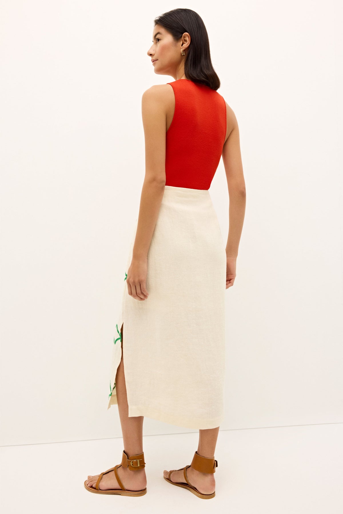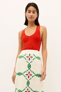 Empowering women through vivid hues and the joy of style, Sarah Doggett Evenson uses her archive of artistic prints, fine fabrics, and flattering silhouettes to make each Marie Oliver piece instantly uplifting. A wardrobe workhorse, the Miranda Tank in Canyon is a seasonal essential. Featuring clean lines and a soft, figure-hugging ribbed knit fabric, this chic basic is designed to tuck neatly into shorts and skirts.