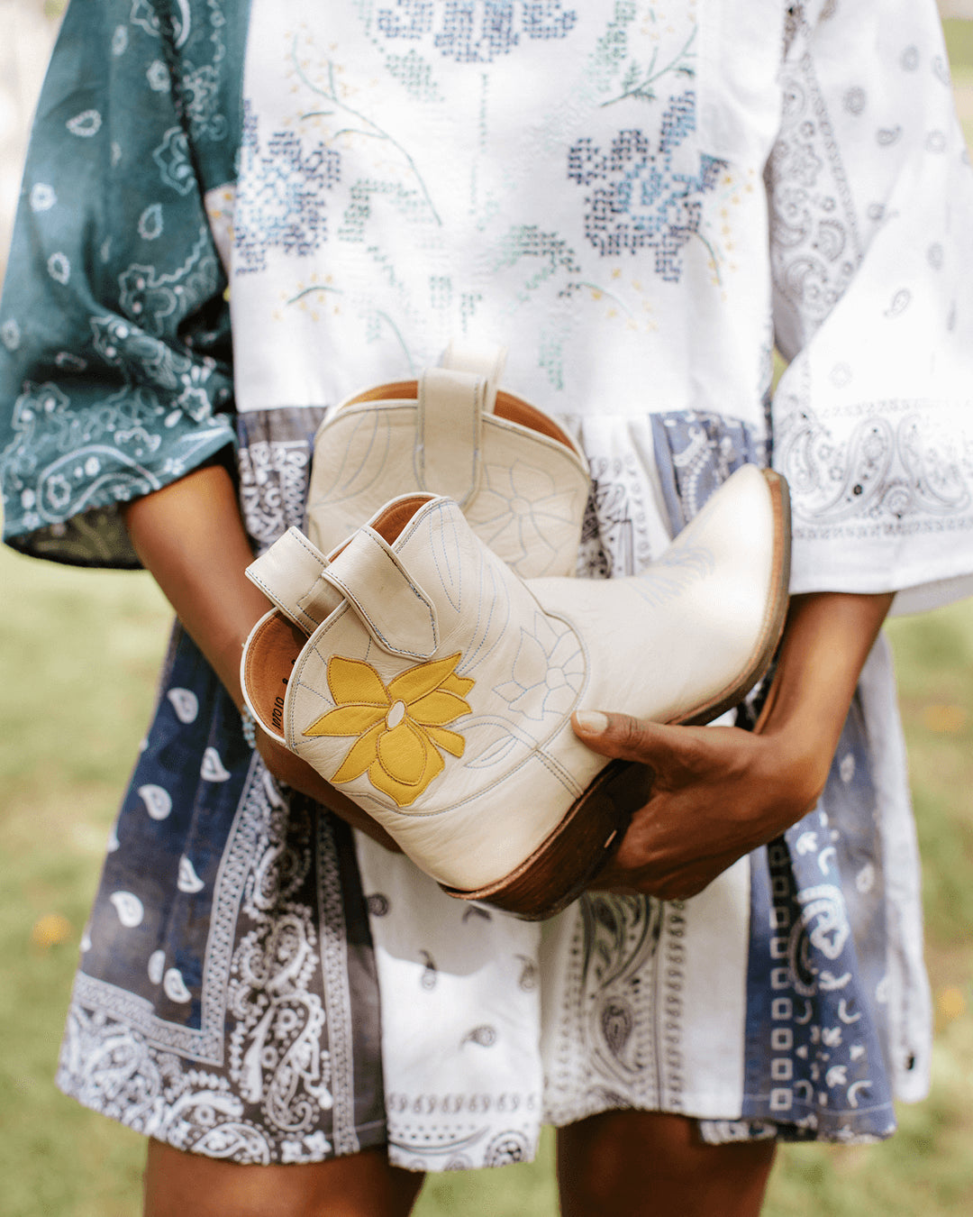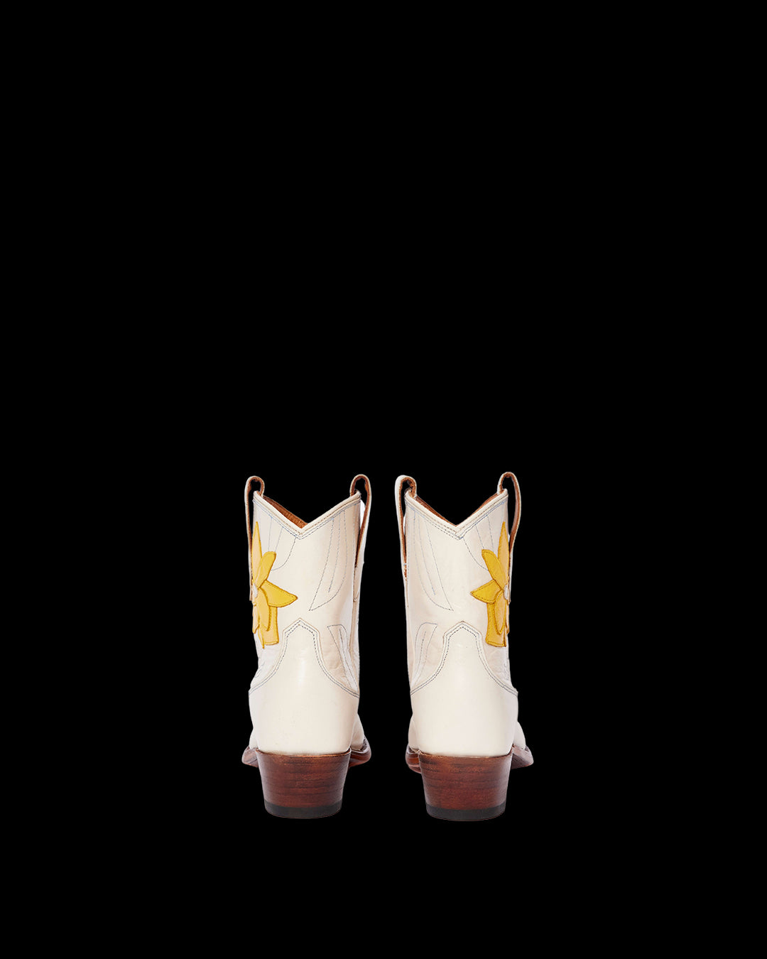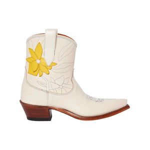 Founded by sisters Lizzie Means Duplantis and Sarah Means, Miron Crosby is inspired by the sisters’ experiences of growing up on their family’s West Texas cattle ranch, and later living and working in New York City. The artisanal boots are designed in New York, handmade in Texas, and created with love for every bride. Make a subtle statement with Missy Crème, the shorty daffodil cowboy boot. Crafted in Crosby crème, Missy is adorned with powder blue stitching and multi-layer floral appliqué.The standout detail of this boot is the vibrant buttercup yellow curving daffodil, which will undoubtedly add a touch of uniqueness to any look. Handmade in Texas and crafted of the finest materials, these cowboy boots are a statement of quality, artistry, and style. Make them your own by customizing them with your monogram on the exterior shaft uppers and your wedding date on the ear pulls. Available exclusively for custom order, please allow 6-8 months for production.