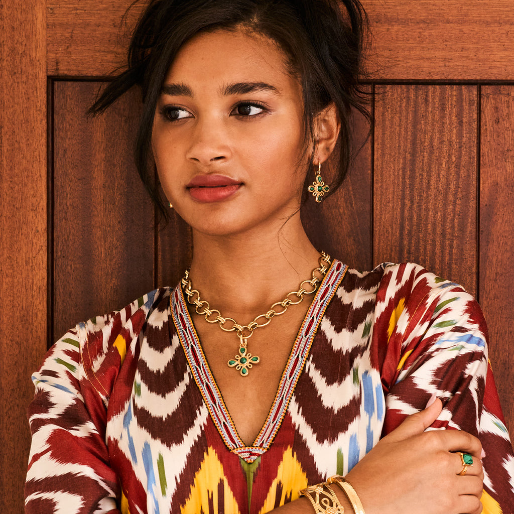 Half-Parisian, half-Texan, Capucine De Wulf’s unique upbringing was the inspiration for her namesake jewelry line. Her accessories combine French romance with an American sensibility. The Monique Gem Pendant in Malachite features a swirling golden compass inlaid with rich green malachite, symbolizing intuition and self-trust. Designed to serve as a daily reminder to follow your true north, this versatile charm can be worn on any chain, from bracelet to necklace.