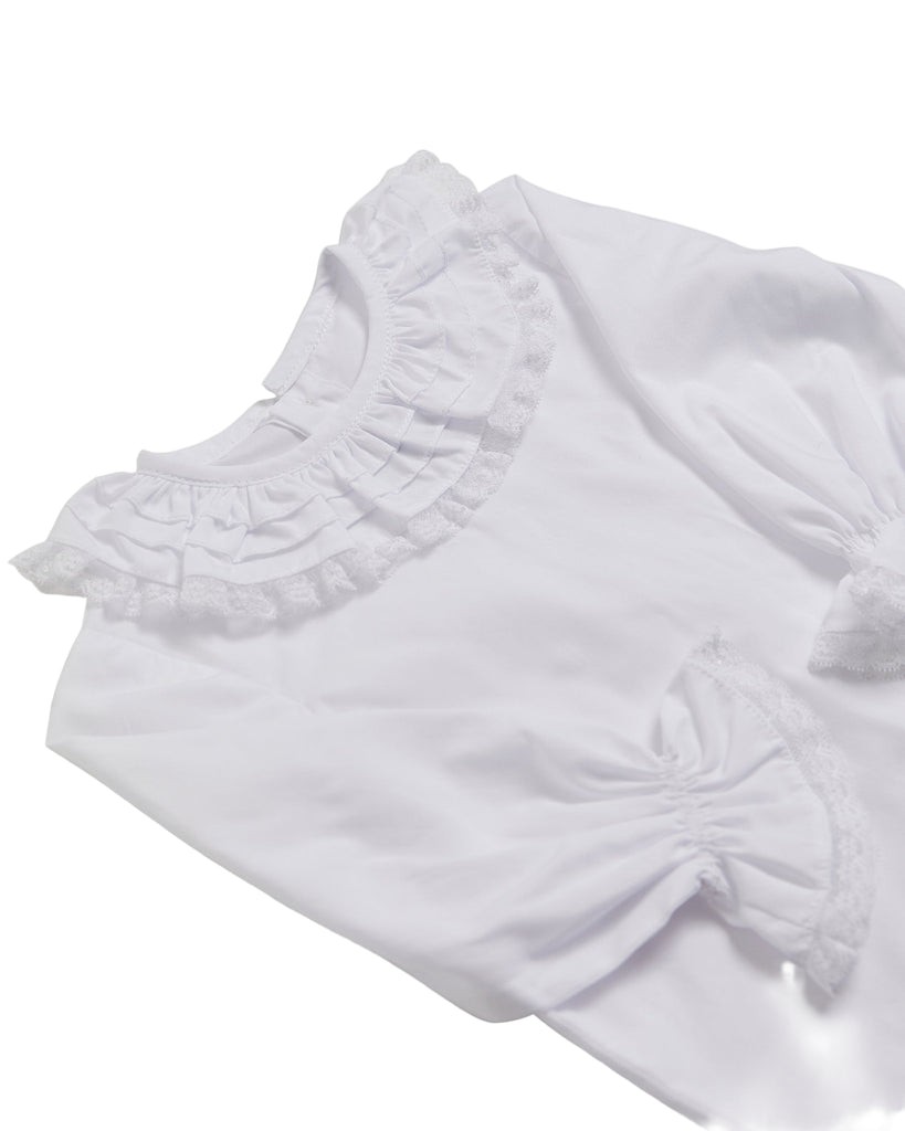White cotton voile. Frilled collar and cuffs. Long sleeves. Back fastening with mother-of-pearl buttons. Made in Spain.