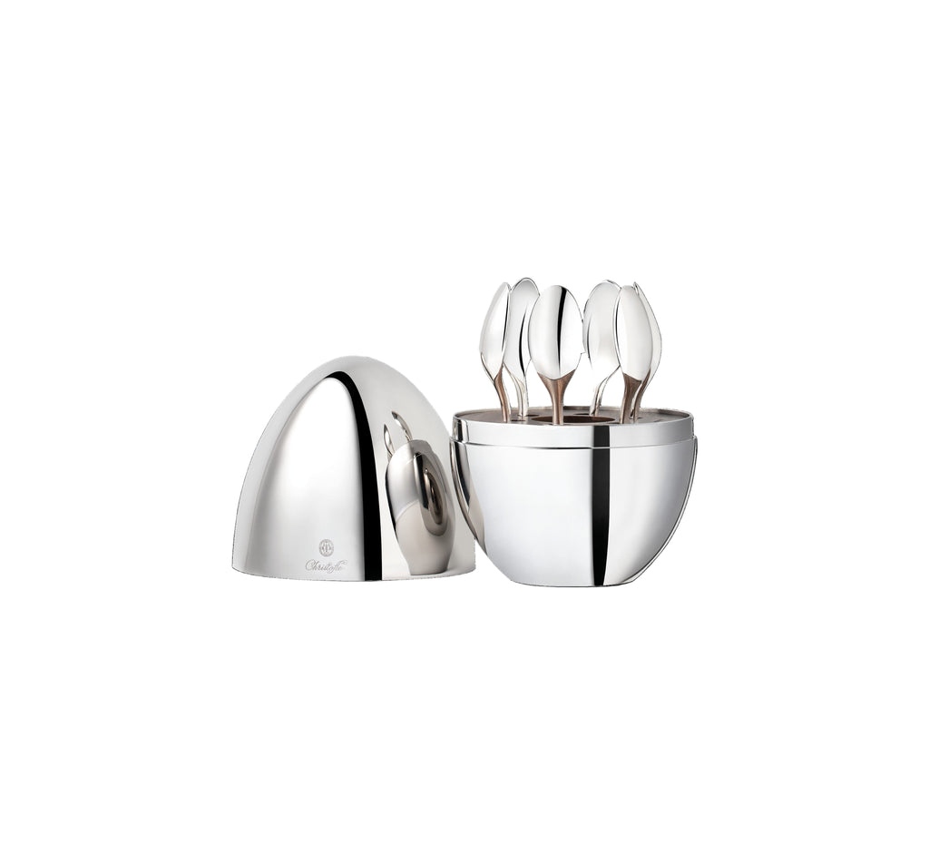 Founded in Paris in 1830, Christofle embodies the pinnacle of French artistry in silverware and tableware, renowned for its pioneering craftsmanship and timeless elegance. The MOOD Coffee Silver-plated Espresso Spoons, Set of 6, is designed for informal dining moments and coffee rituals. Presented in a sculptural egg-shaped storage capsule, this contemporary set brings both function and refinement to the table.
