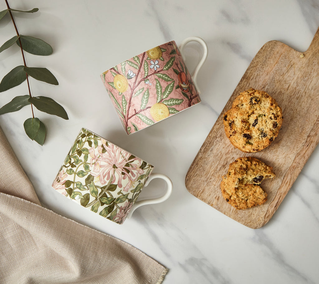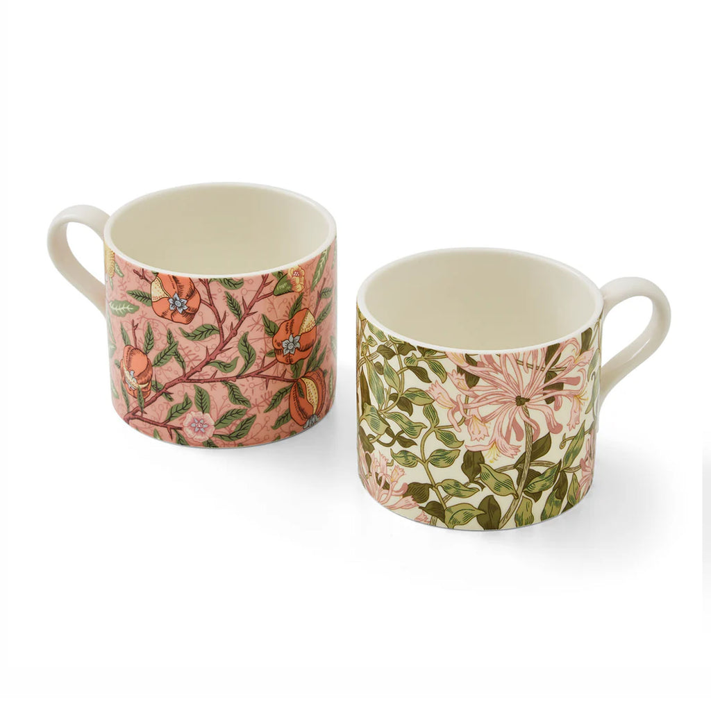 Founded by Josiah Spode in 1770, Spode has been producing the finest ceramics and celebrated designs in Stoke-on Trent, England for 250 years. Spode is the authority on great British style bringing heritage style to modern day life. Celebrate 160 years of Morris & Co. with the truly beautiful Morris & Co. Mugs in Fruit & Honeysuckle, Set of 2. Featuring two of the brand’s heritage designs - Fruit and Honeysuckle - this set of mugs will add a subtle, yet striking touch to your kitchen. The Fruit design was originally called ‘Pomegranate’ and is one of the earliest Morris & Co. designs, first produced in 1864. Featuring a scattering of pomegranates, peaches and lemons, this elaborate design will look right at home in your kitchen. The Honeysuckle design is another favorite, with pretty, delicate flowers and intertwining leaves, adding a touch of the outdoors into your home. From morning coffee to afternoon tea.