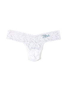 Hanky Panky's signature V-front and V-back waistband revolutionized the world of lingerie 30 years ago and has put an end to panty-lines. Soft and stretchy, Hanky Panky officially makes the World's Most Comfortable Thong. Fitting low on the hips and easily transported, the Low Rise Thong gets a wedding night upgrade with "Mrs" embellishment on the waistband. It's a sexy blend of lace, cheek, and your new title in "something blue" crystals.