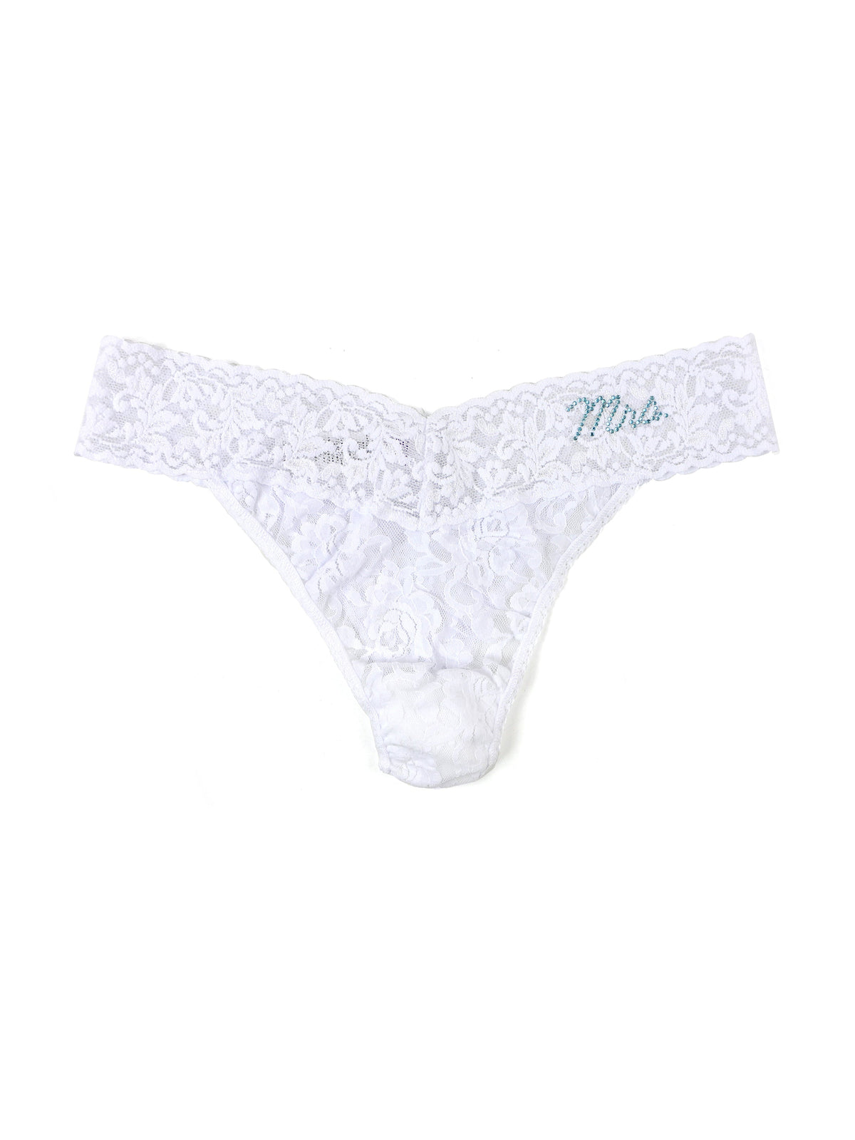 Hanky Panky's signature V-front and V-back waistband revolutionized the world of lingerie 30 years ago and has put an end to panty-lines. Soft and stretchy, Hanky Panky officially makes the World's Most Comfortable Thong. Fitting high on the hips and easily rolled up and transported, the Original Rise Cotton gets a wedding night upgrade with "Mrs" embellishment on the waistband. It's a sexy blend of lace, cheek, and your new title in "something blue" crystals.