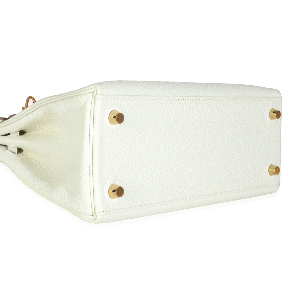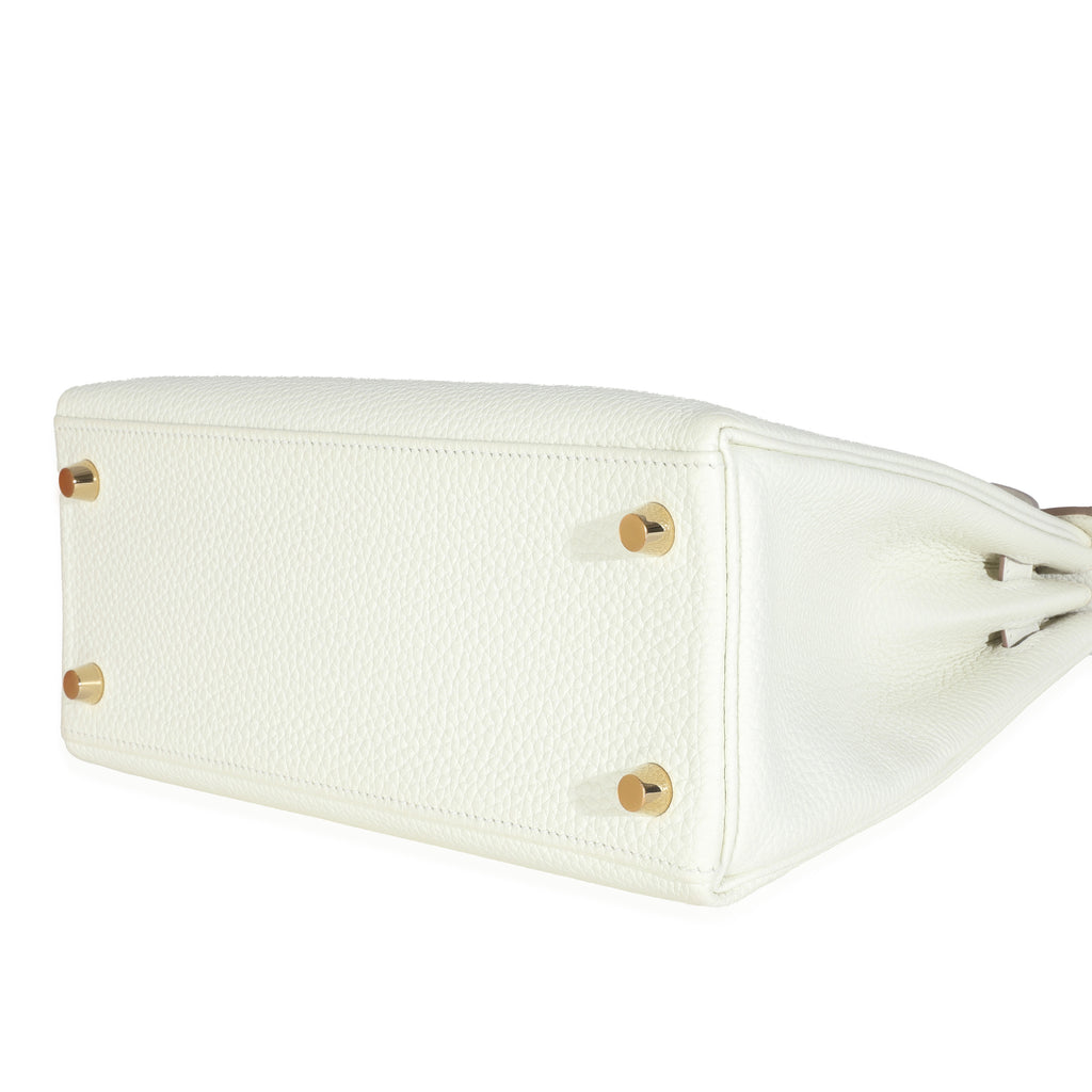 Pre-owned Hermès Kelly 25 Retourne in Mushroom Togo leather with gold hardware, circa 2023. Item has no indication of wear. Features a top handle, removable shoulder strap, flap closure with turn-lock fastening, and leather interior with zip and slip pockets. Includes original box, clochette, dustbag, receipt, felt protector, retail tag, and removable strap. Made in France.