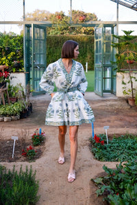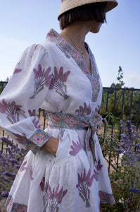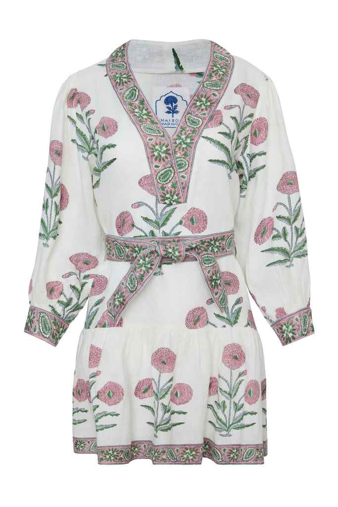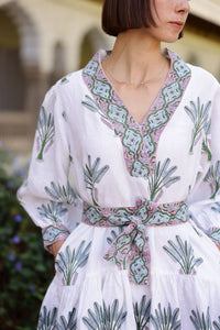 Introducing Maison Marigold, a new luxurious small-batch women’s resortwear brand inspired the wanderlust of travel. Our collections effortlessly transition from beachside lounging to an elegant evening on the town. The simplicity of design and classic silhouettes are the foundations for each and every style. Hand-printed linen and cotton make for comfortable and effortless pieces that are both feminine and flattering. The Mykonos Mini Dress in Blue Palm has an feminine and flirty silhouette. The dress is hand block printed on 100% European linen with a V-neck opening and matching optional belt. This dress features hidden side seam pockets and adjustable mother-of-pearl buttons at the wrists.