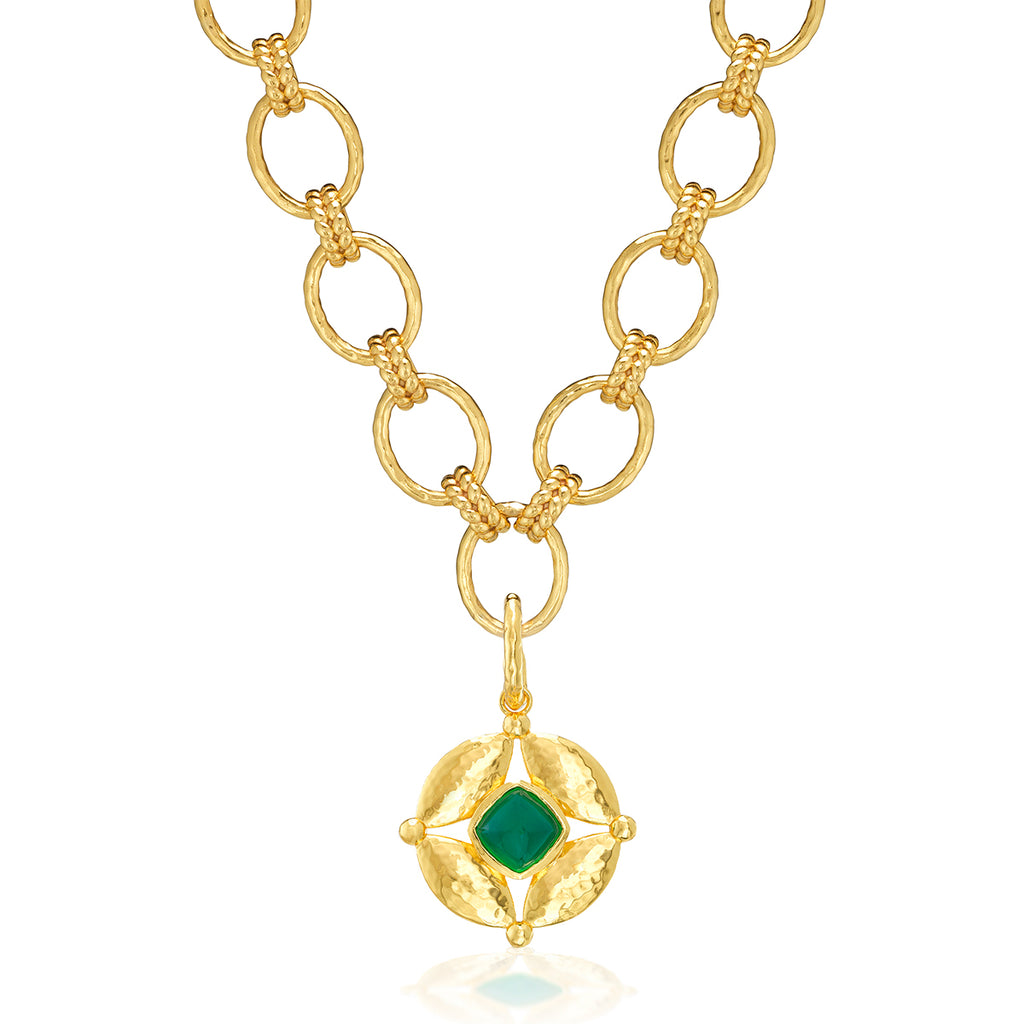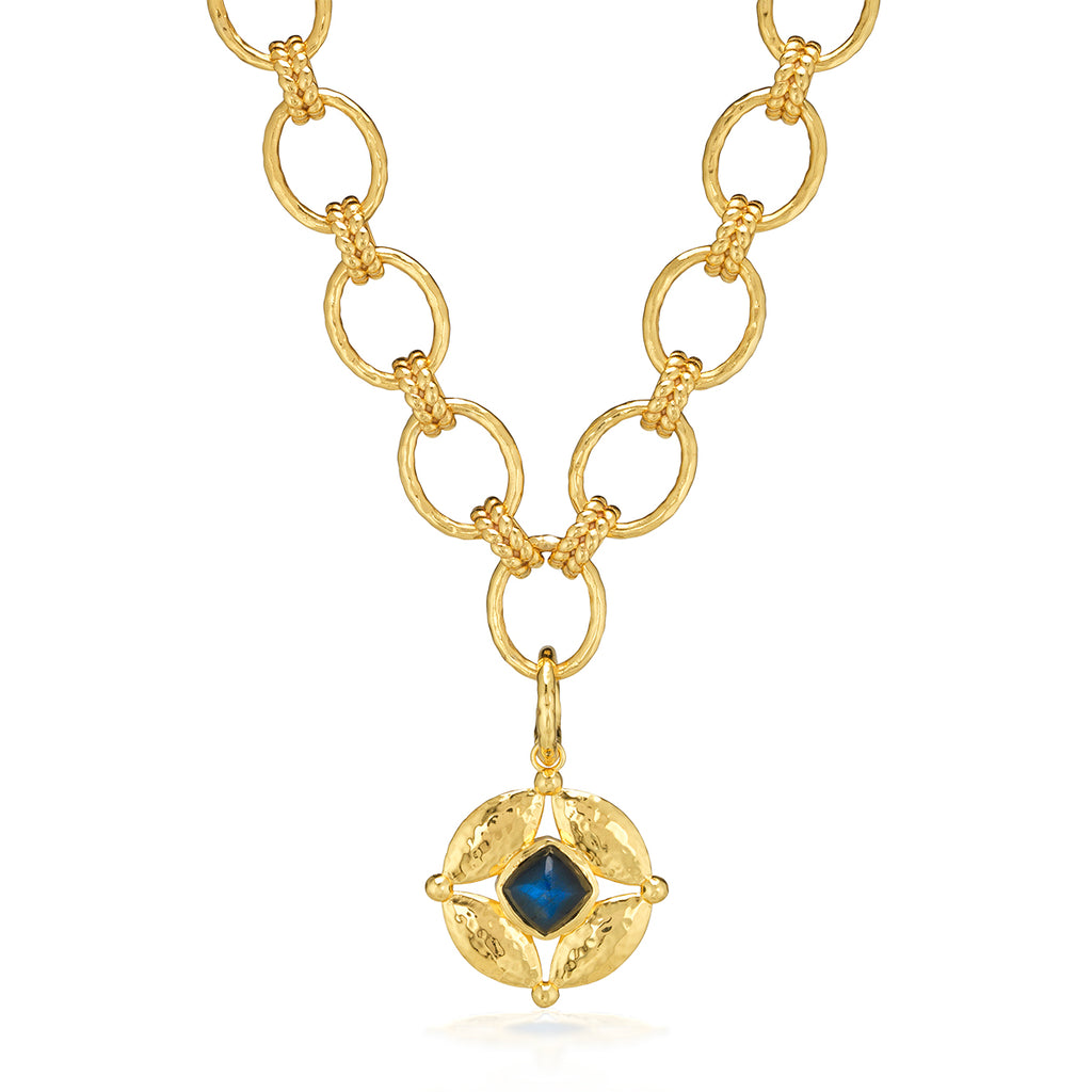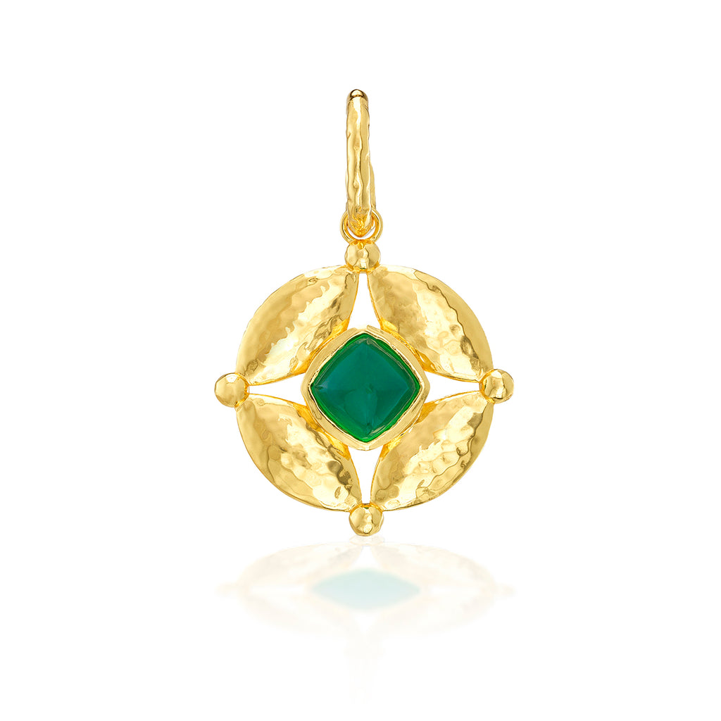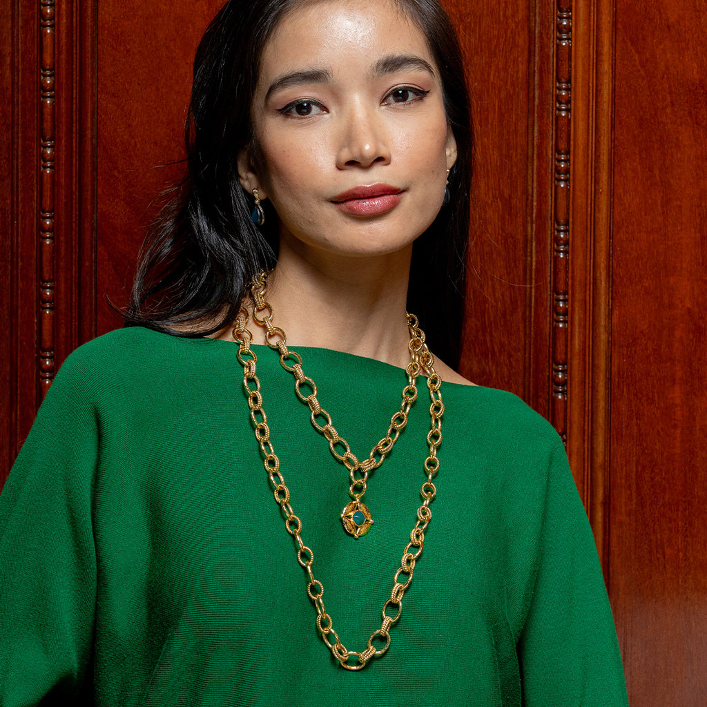Half-Parisian, half-Texan, Capucine De Wulf’s unique upbringing was the inspiration for her namesake jewelry line. Her accessories combine French romance with an American sensibility. The Mystic Eye Double-Sided Pendant in Blue Labradorite & Green Onyx is a vibrant expression of intuition and balance, crafted in hammered gold with one side featuring lush green onyx and the other, luminous blue labradorite. Symbolizing the harmony between heart and mind, this radiant charm reminds you to trust your inner wisdom wherever you go.