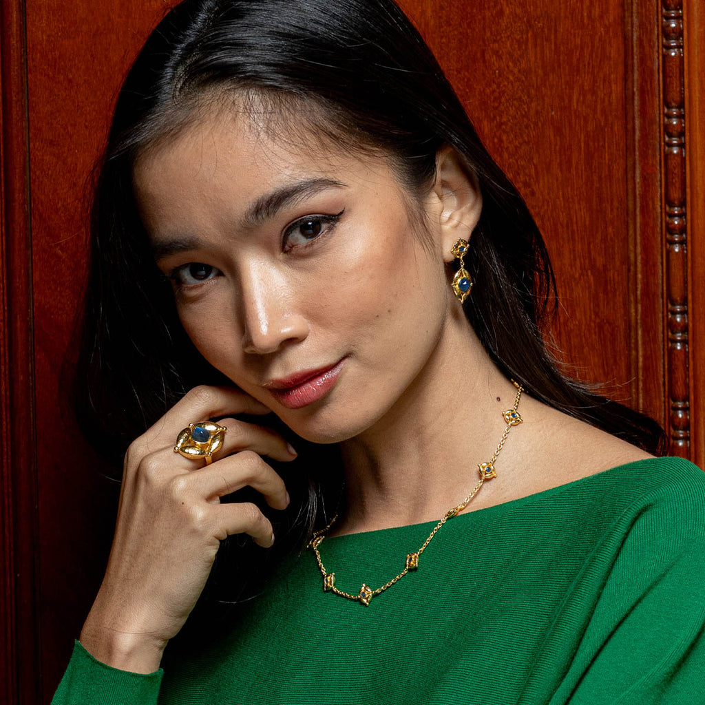Half-Parisian, half-Texan, Capucine De Wulf’s unique upbringing was the inspiration for her namesake jewelry line. Her accessories combine French romance with an American sensibility. The Mystic Eye Post Drop Earrings in Blue Labradorite showcase the brand’s signature motif, featuring vivid blue labradorite gemstones framed in bright hammered gold. Elegant yet alluring, this luminous pair transitions effortlessly from day to night, serving as a radiant reminder to trust your intuition and let your inner light shine.