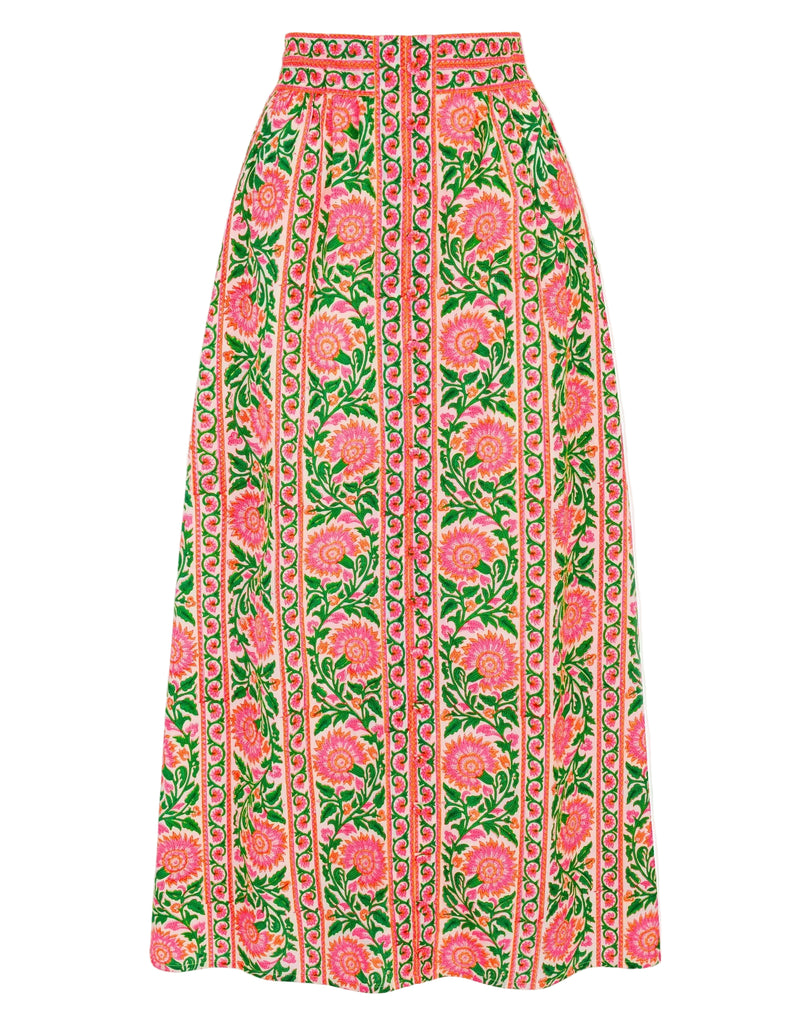 The Neon Peacock Freya Skirt is hand block-printed in vibrant shades of neon pink and orange, bringing bold color to an effortlessly refined silhouette. Designed with a flattering straight-cut shape and an elasticated back for added comfort, this versatile style transitions seamlessly from holiday dressing to everyday wear. Pair with the coordinating Agnes Blouse for a striking statement look or style with a classic white tee for relaxed days in town.