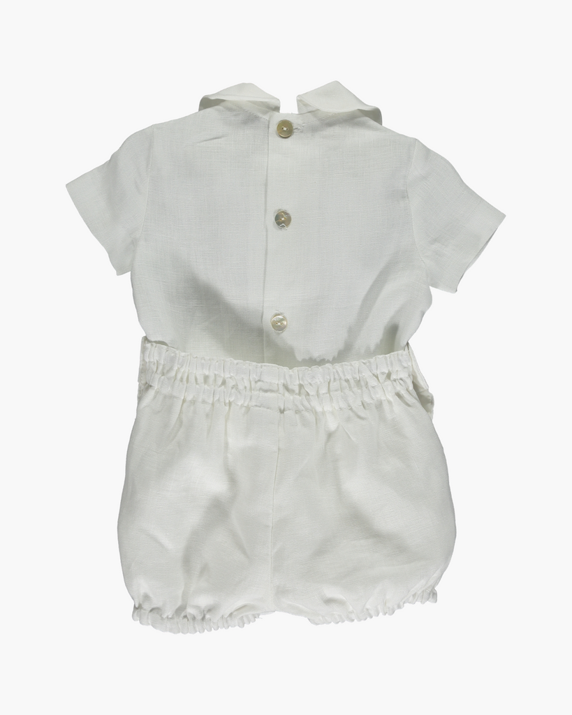 100% linen. Shirt with lace trim and back button fastening. Elasticated bloomers. Made in Spain.