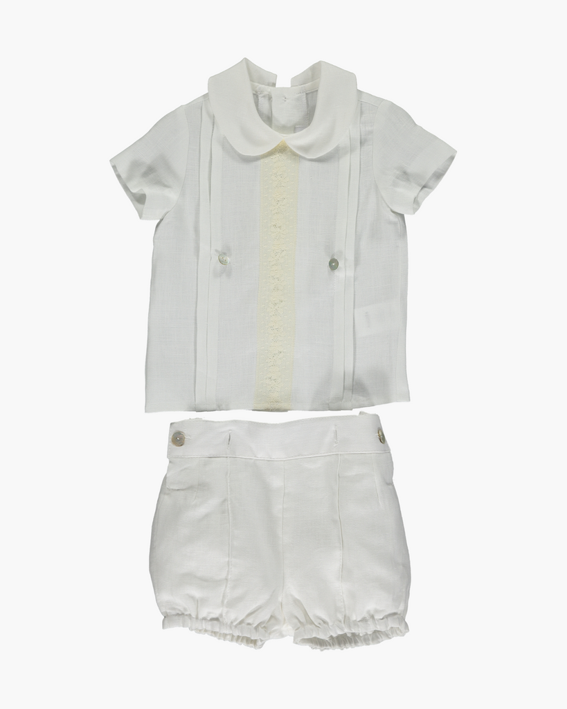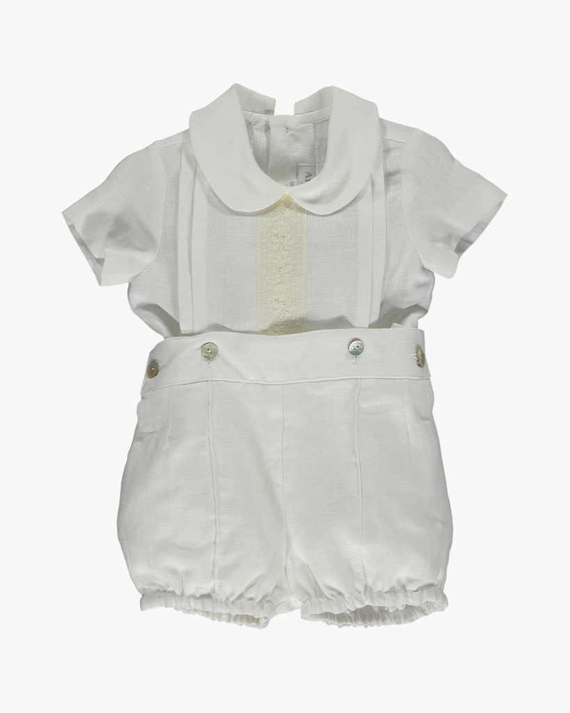 The Nicholas Baby Set in Off White is a timeless ensemble designed for special occasions. This elegant two-piece set includes a soft linen shirt with a traditional Peter Pan collar, delicate lace detailing, and a back button fastening, paired with matching bloomers featuring elasticated hems for comfort and ease. Refined and classic, it’s a beautiful choice for christenings, celebrations, or family gatherings.