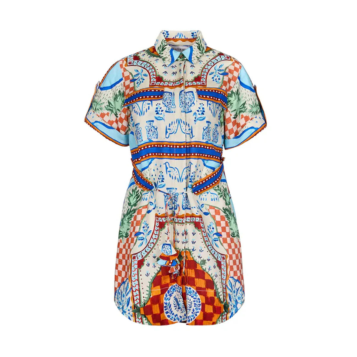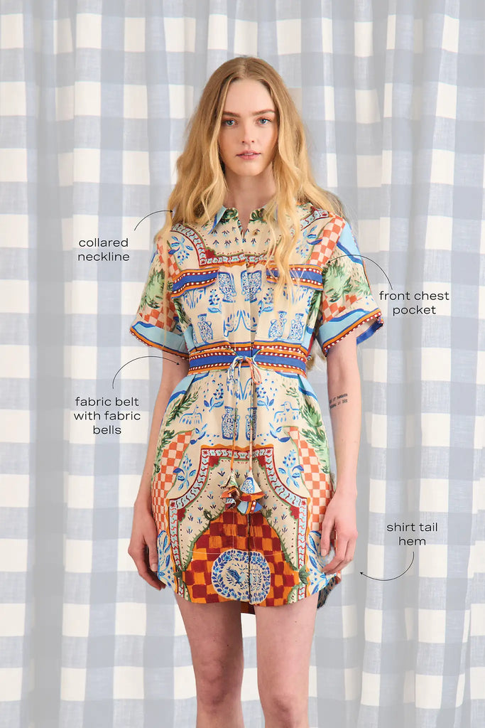 Hunter Bell brings joyful, polished pieces to life with a distinctive mix of bold pattern, thoughtful tailoring, and feminine charm. The Nicole Dress in Sundance Tile reimagines the classic shirt dress with modern ease and a playful twist. Designed with a relaxed fit, this mini features a crisp collar, short cuffed sleeves, and patch pockets that nod to utilitarian charm. A self-tie belt with fabric bell ends cinches the waist to balance the volume, while the bold print adds standout appeal. Easy yet refined, Nicole moves seamlessly from casual days to dressed-up moments.