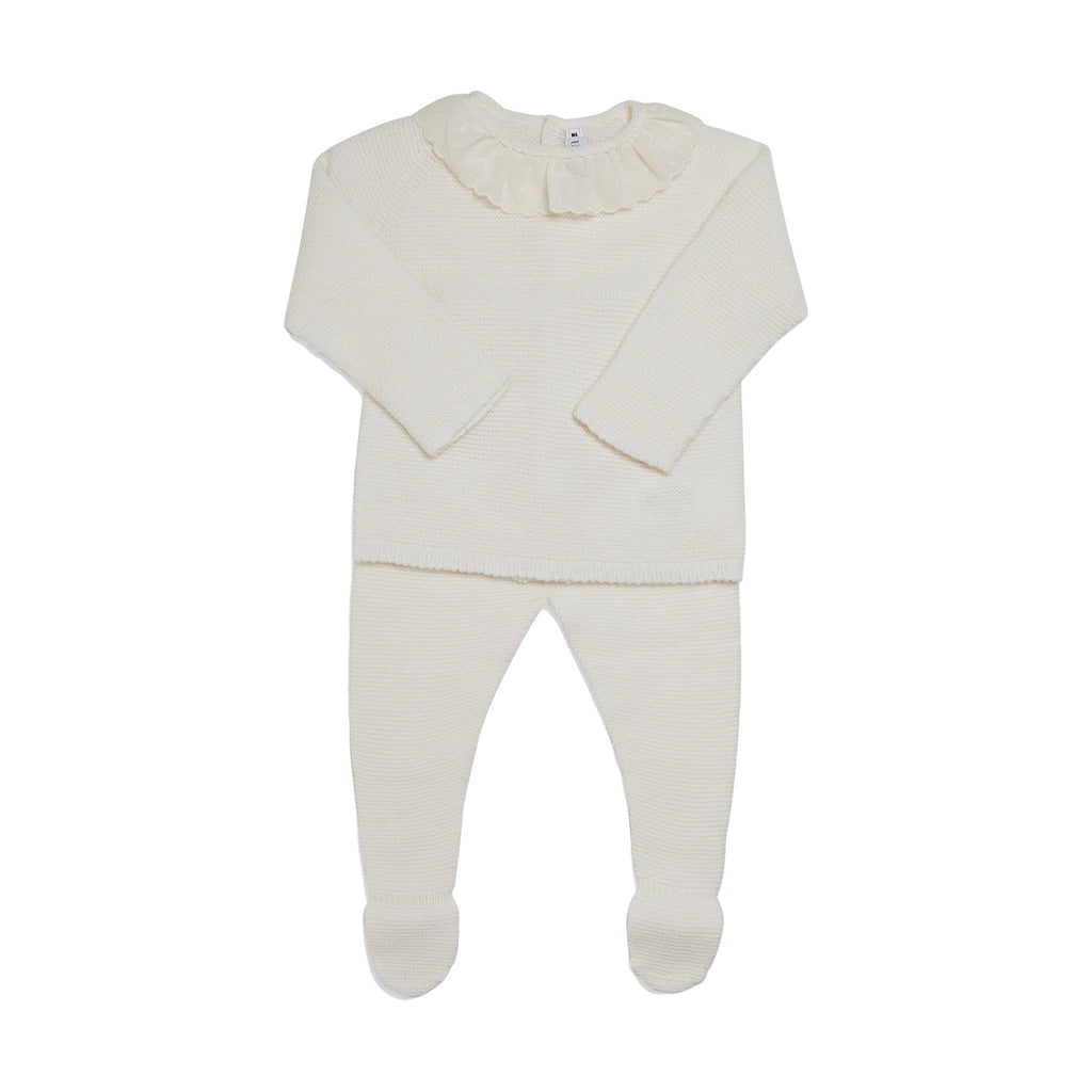The Nora Baby Set in Ivory combines cozy comfort with timeless elegance. Crafted in a soft knit, this charming jumper features dropped shoulders, long sleeves, and a refined white scalloped plumetti collar for a delicate finish. Mother-of-pearl buttons fasten at the back for ease of dressing. Pair with coordinating Evie leggings for a beautifully polished look—an ideal gift for a newborn.