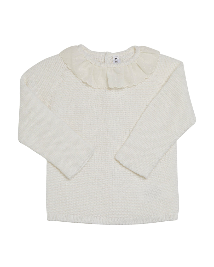Soft pink knit. White scalloped plumetti collar. Back fastening with mother-of-pearl buttons. Dropped shoulders and long sleeves. Made in Spain.