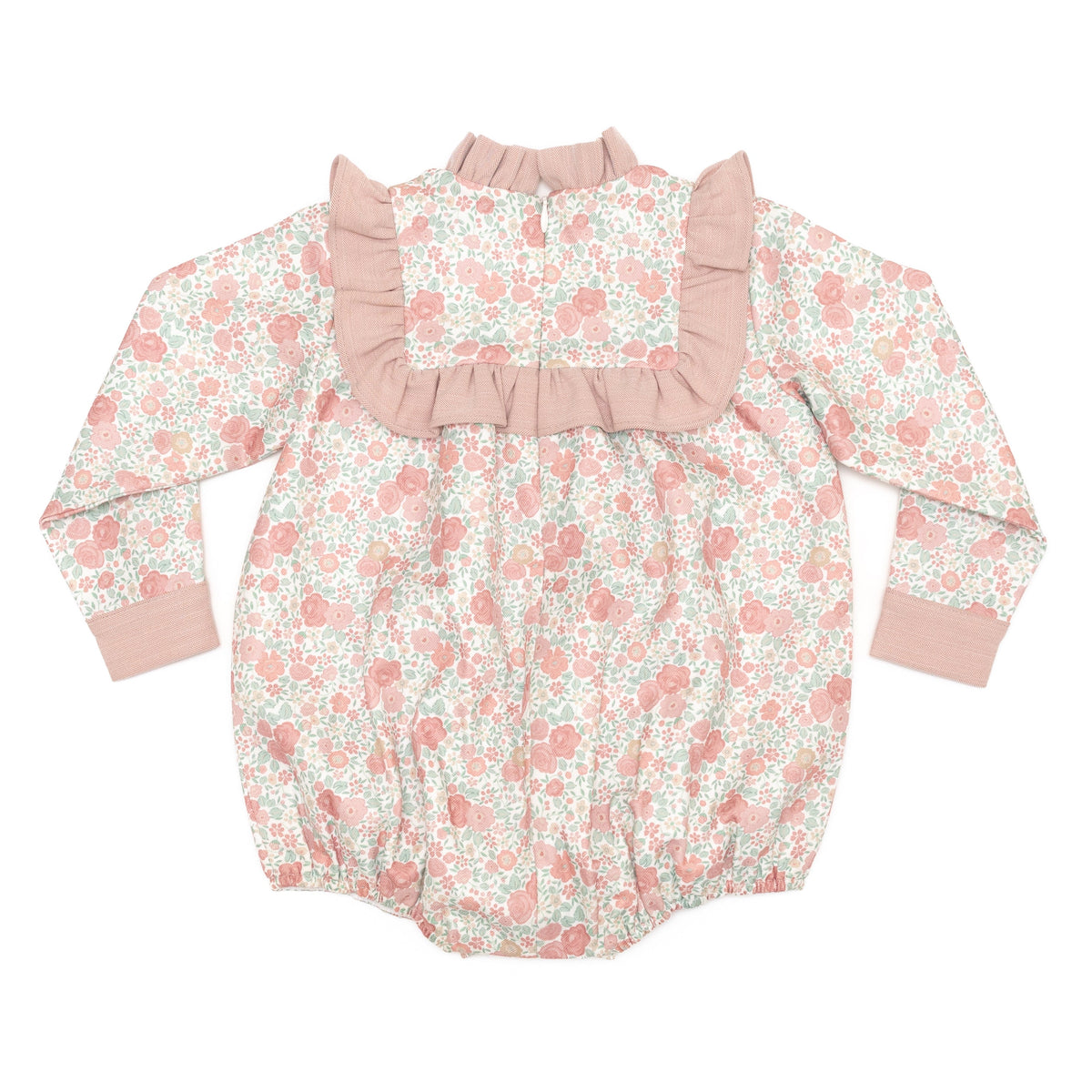 Beacon Hill Blooms print with Parker Pink Herringbone trim. Ruffle and neckline details. Fully lined. Button closures. Elasticized leg openings.