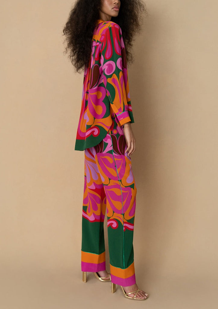 Inspired by the great art museums of the world, Carmen Borgonovo and Joana de Noronha use romantic silhouettes and surreal, bespoke prints, to create dresses that not only empower women, but transport them. These versatile, tailored pieces will bring joy to your wardrobe, and glamour to your world. The retro hues and architectural pattern of the Nova Crepe Shirt in Seventies Orange stands out in any room.