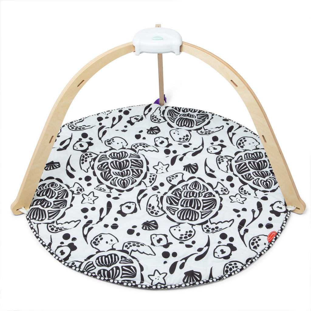 Includes sturdy wooden frame and reversible mat featuring high-contrast black and white graphics on one side and a colorful ocean scene on the other. Comes with five washable, skill-supporting toys: wiggly octopus, chiming turtle, safety mirror, crinkly starfish, squeaking crab, and rattling manta ray. Folds easily with a quick-close button for portable, space-saving storage. Made with FSC-certified materials. Recommended for infants from birth to 9 months.