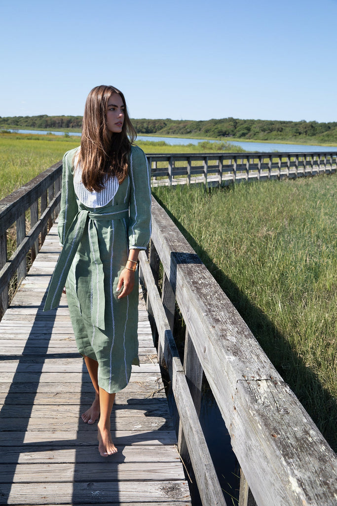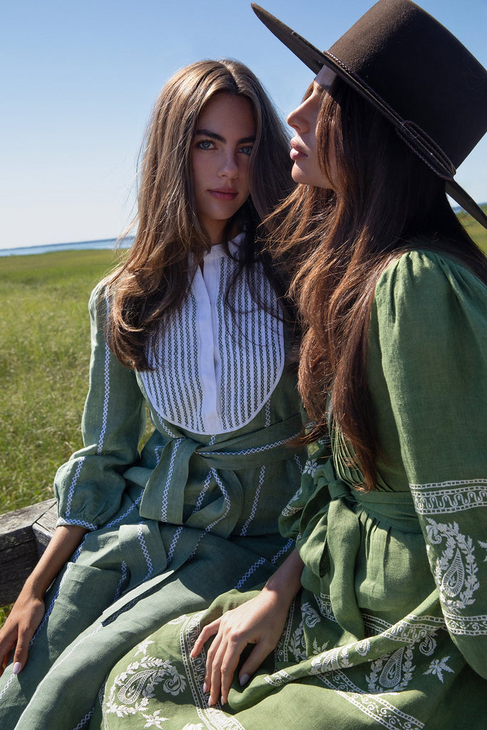Inspired by art, architecture, and the founder’s global journeys, ASHA by Ashley McCormick introduces bold, sophisticated jewelry and accessories made from only the finest materials. From everyday glamour to the red carpet, these statement pieces are classic additions to your collection. The Olive Greer Shirtdress takes its cue from classic fall shirting, reimagined with a bohemian twist. Cut in earthy olive linen and striped with delicate white embroidery, it features a crisp bib front that nods to heritage tailoring. A self-tie belt cinches the waist, giving shape to the relaxed silhouette, while billowed sleeves add a touch of romance. At once grounded and free-spirited, Greer moves effortlessly from countryside walks to evenings under autumn skies.