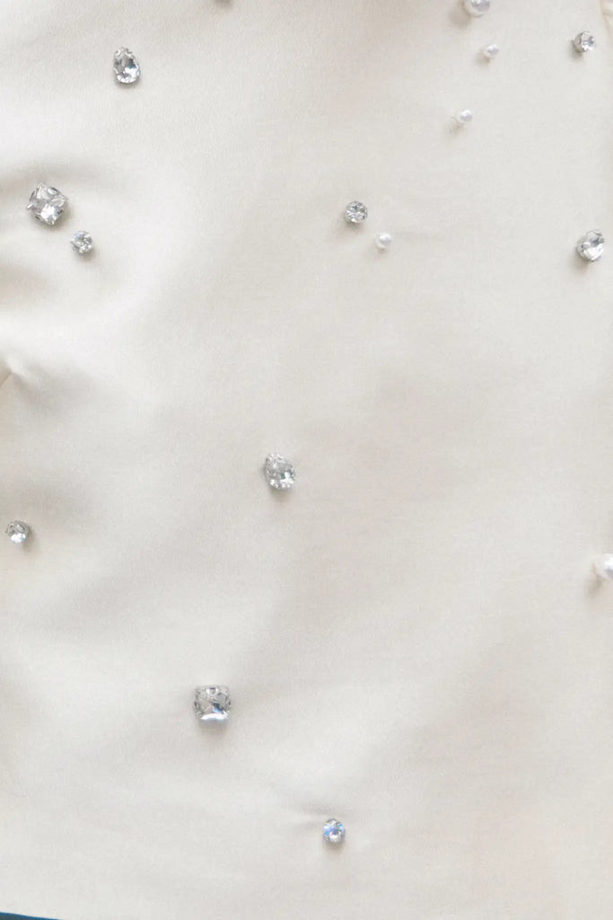 The Olivia Top in Ivory embodies understated glamour. Cut from luminous duchess satin, this short-sleeve crewneck silhouette is hand-embroidered with pearl and rhinestone detailing for a refined touch of sparkle. Pair it with the Britt Mini Skirt’s contrast color design for a chic color-block statement that feels both festive and timeless.