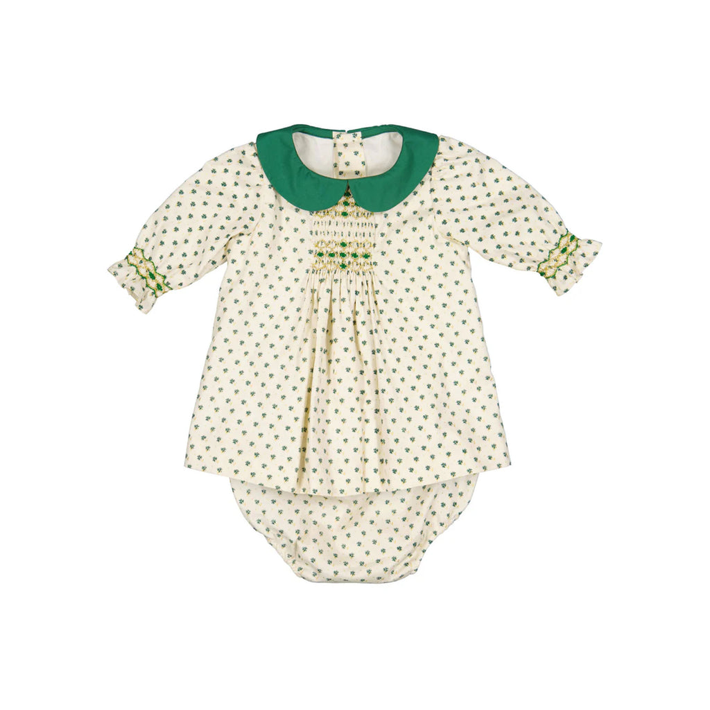 100% double-layer cotton. Handmade bubble with green and gold geometric embroidery at chest and cuffs. ¾-length sleeves with frilled cuffs. Green Peter Pan collar and covered back buttons. Available in a red variant. Coordinates with the Olympe Smock Dress for matching sister holiday outfits.