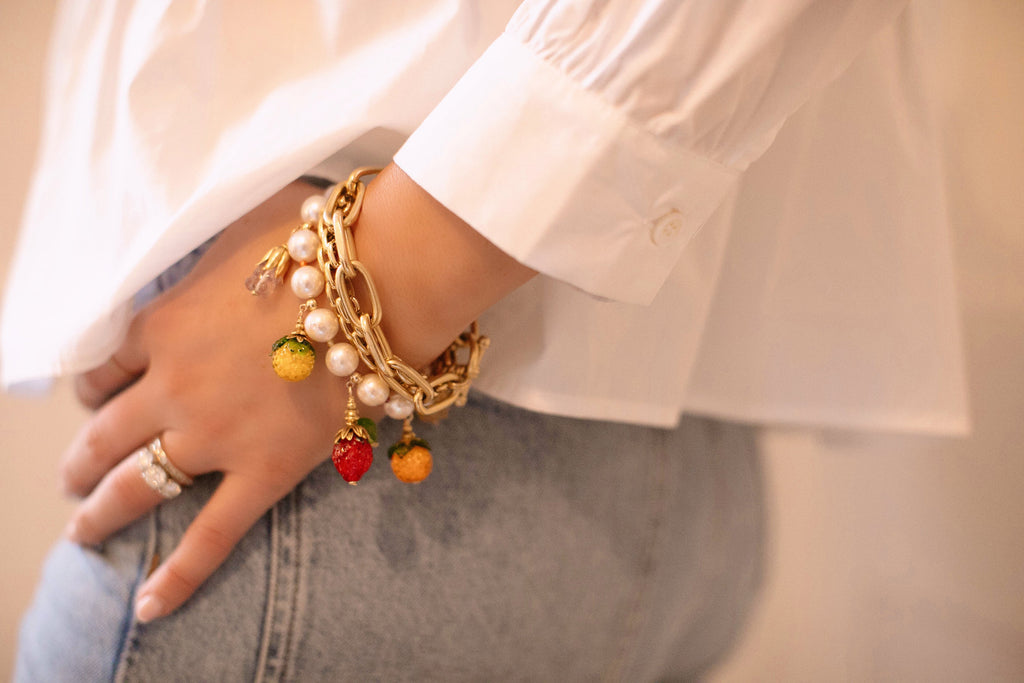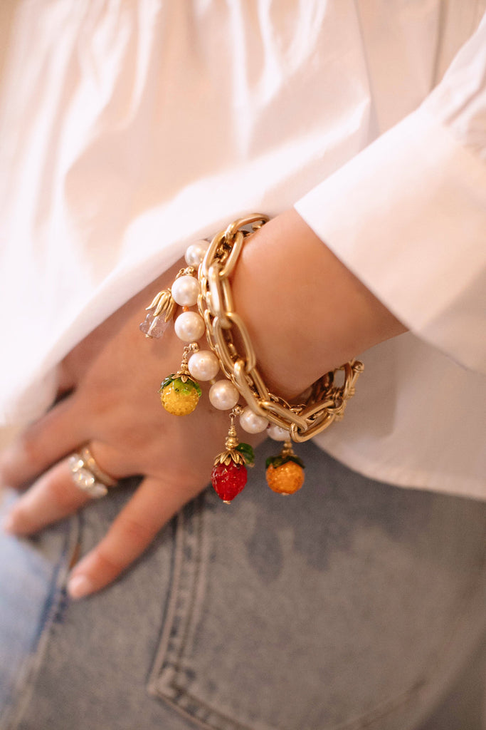 Toggle closure. Strand of freshwater pearls and mini faceted zircon rondelle beads adorned with glass fruit charms. No two beads are exactly alike.