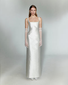 Handmade at its London atelier, The OWN Studio’s signature style combines pared-back, contemporary silhouettes with unexpected vintage details resulting in considered, minimal styles for the modern woman. The label brings a fresh and contemporary approach to wedding and evening wear. An elegant and refined column mikado silhouette that is as chic as it is timeless, this angular square neckline is softened by an accent of silk organza. Fully lined in silk, pair the Organza Peekaboo Silk Mikado Gown | STYLE 111 with tulle gloves and the matching detachable silk train for the most incredible statement.