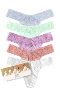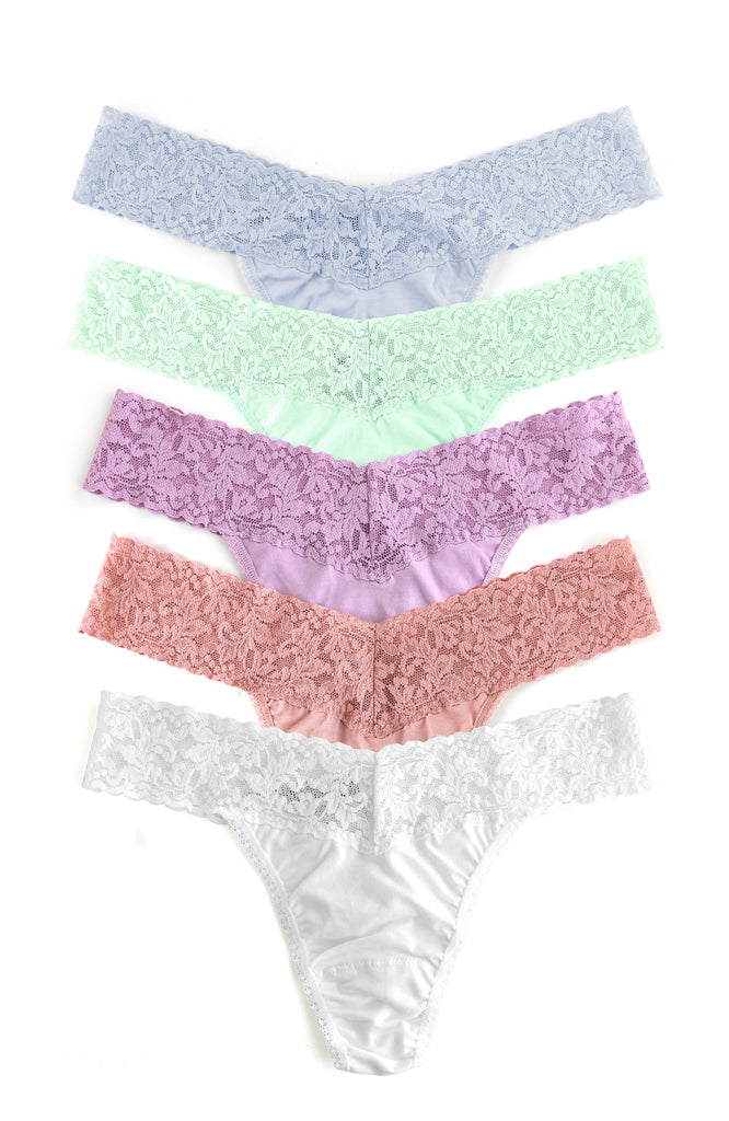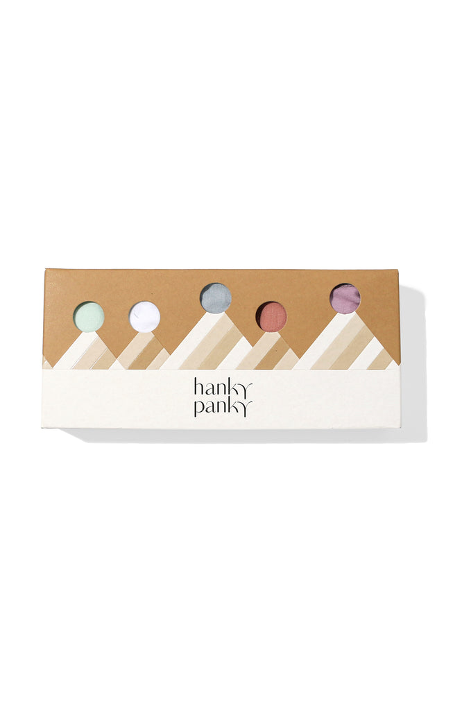 Hanky Panky's signature V-front and V-back waistband revolutionized the world of lingerie 30 years ago and has put an end to panty-lines. Soft and stretchy, Hanky Panky officially makes the World's Most Comfortable Thong. Fitting high on the hips and easily rolled up in your lingerie drawer, the Original Rise Cotton 5-Pack, Holiday 2022 come in an array of colors, and are crafted in the brand's signature stretch lace. The perfect gift for that cheeky someone in your life.