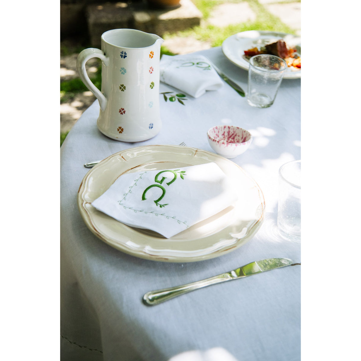 Cibelle embroiders the olive trees, vineyards, lemons, patterns and gardens of Puglia’s countryside to tell the stories of its landscapes and people through their table linens. Using 100% Italian linen and gorgeous embroideries, hand-crafted at every step, each Cibelle piece speaks to its founder Raffaella Gemiti’s mission to combine the craft, culture, and natural beauty of her homeland in unsurpassed table settings. Inspired by Puglia's rich heritage of olives, embroidered with fine cotton, the Oro Verde Napkin adds an elegant touch to any meal, and can be paired back to its matching placemat.